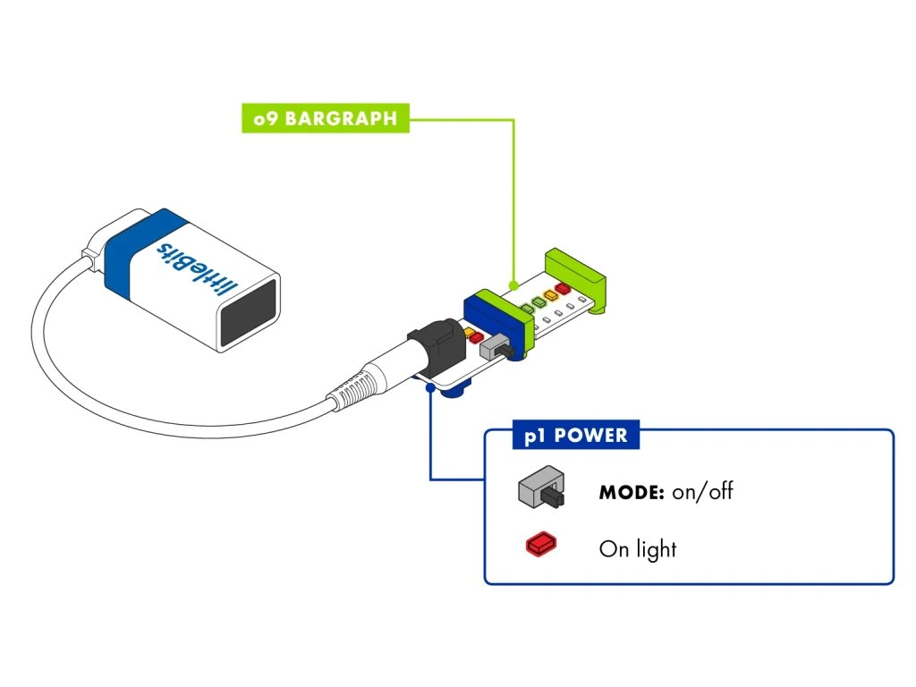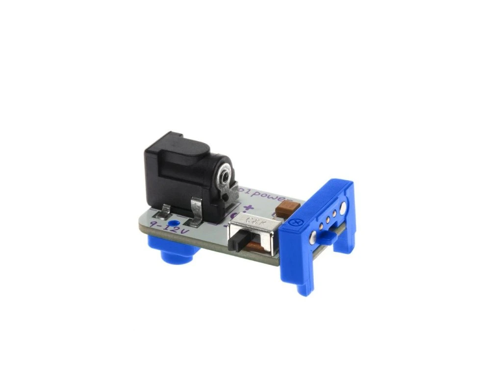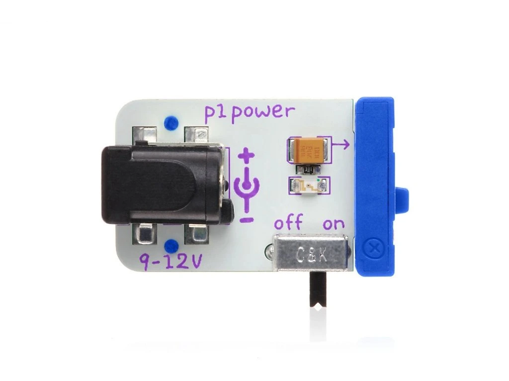 Spolu s 9 voltovým galvanickým článkem a vodiči (potřebné objednat zvlášť) dodá tento prvek do obvodu prvků littleBits elektrickou energii.