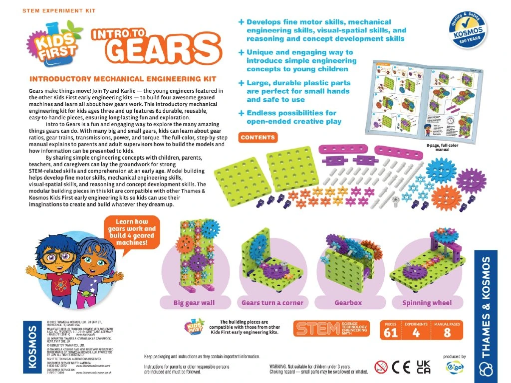 Sdílením jednoduchých inženýrských konceptů s dětmi mohou rodiče a učitelé položit základy pro vztah dětí k vědě a technice již v raném věku. Sestavování modelů pomáhá rozvíjet jemné motorické dovednosti, strojařské dovednosti, vizuálně-prostorové dovednosti, uvažování a rozvoj konceptů. Modulární stavebnice v této soupravě jsou kompatibilní s ostatními stavebnicemi Thames & Kosmos Kids First, takže děti mohou využít svou fantazii na vytvoření a sestavení čehokoli, co si vysnívají.