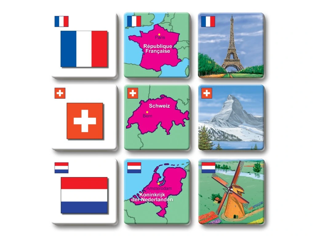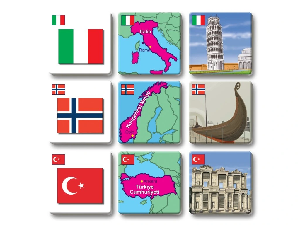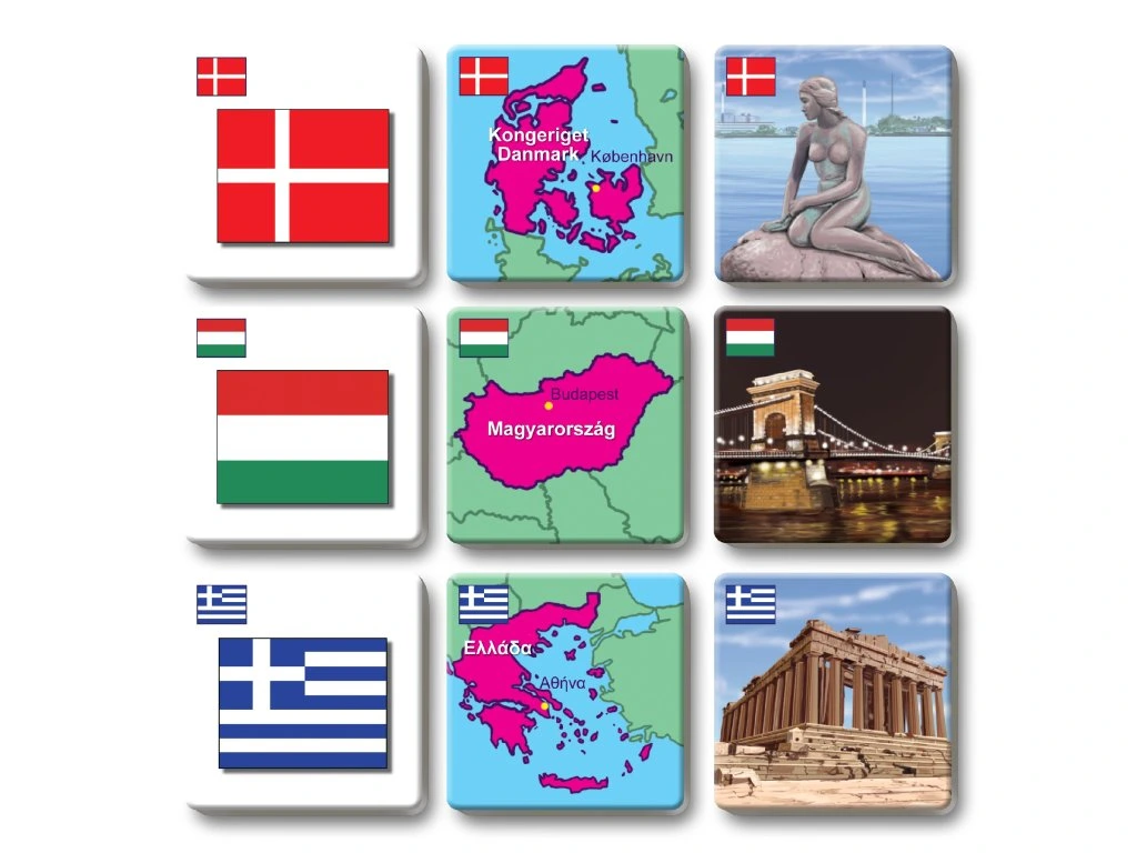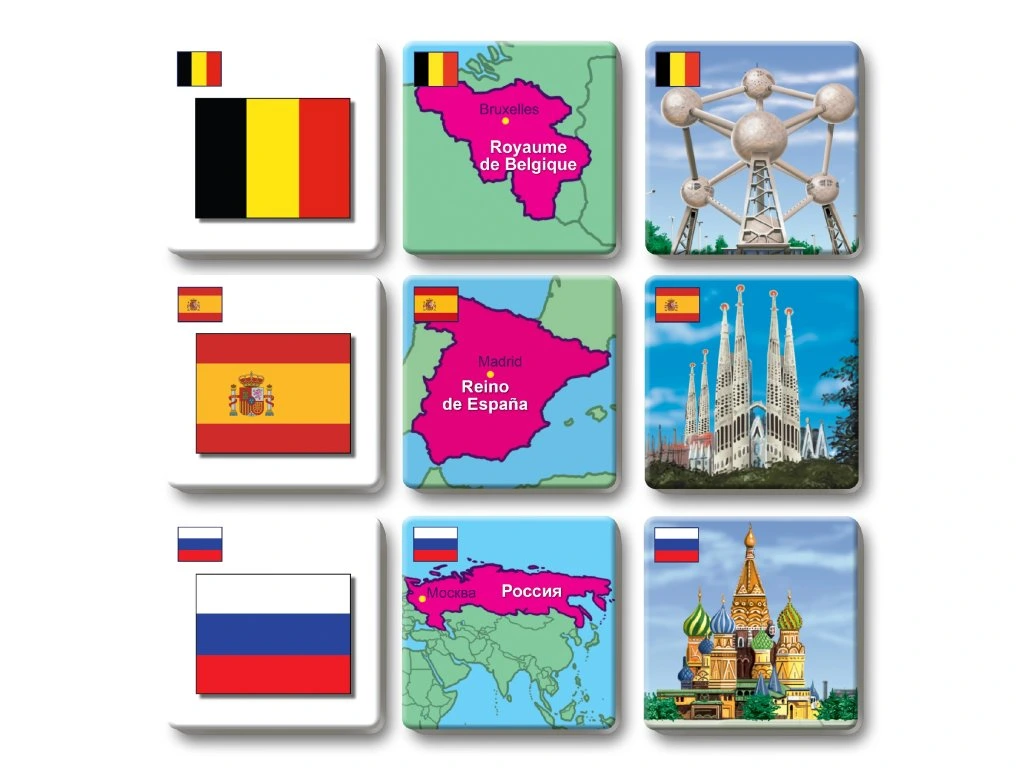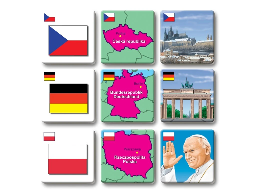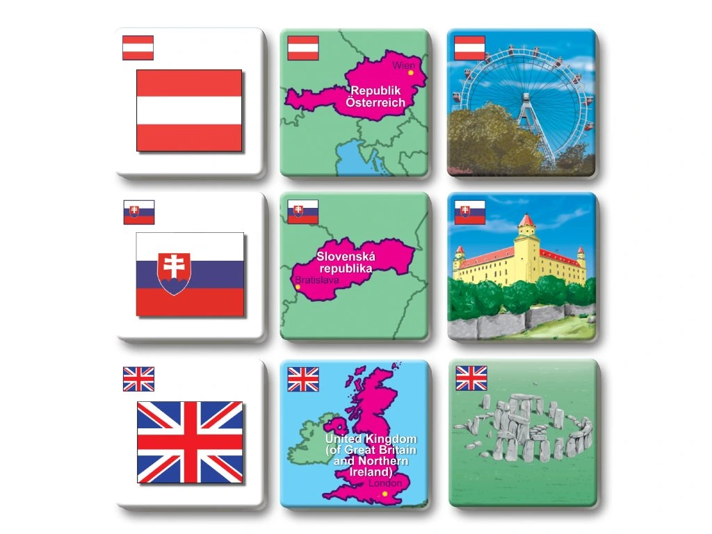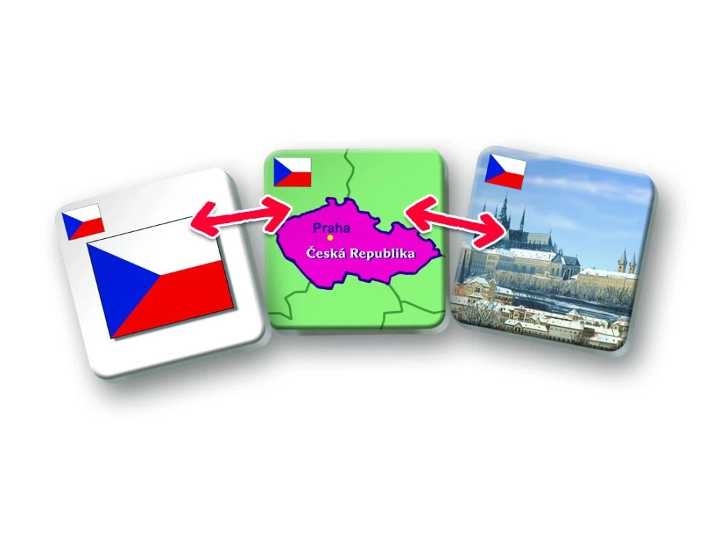 Hra rozvíjí logické myšlení a paměť tím, že děti hledají trojice kartiček s vlajkou, mapkou a stavební památkou stejného státu.