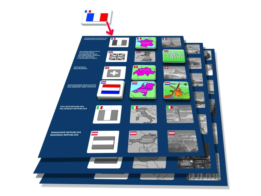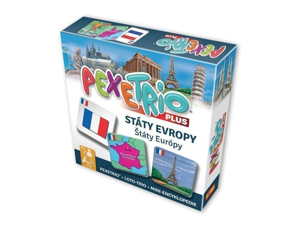 Pexetrio STÁTY EVROPY je zábavná a vzdělávací hra inspirovaná pexesem, která učí děti poznávat vlajky, mapky a stavební památky jednotlivých států podle hesla „škola hrou".