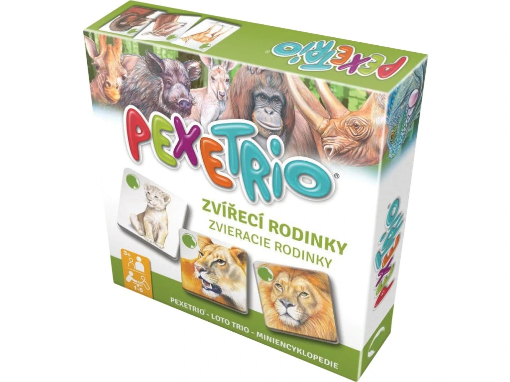 Pexetrio ZVÍŘECÍ RODINKY jsou zábavné a didaktické hry inspirované pexesem, které děti učí rozpoznávat samce, samici a mládě u různých zvířecích druhů podle hesla „škola hrou".