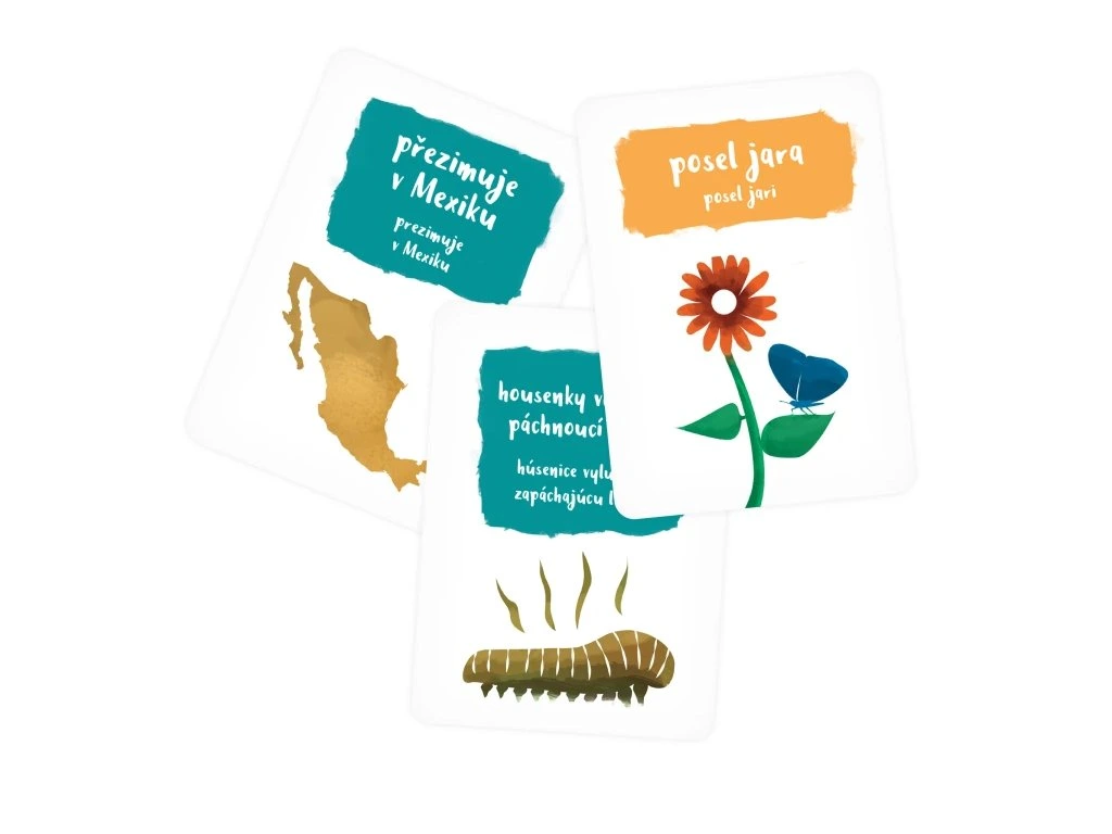 Jakou vzdálenost urazí Monarcha? Je Martinák denní, nebo noční motýl? Pidikarty jsou svižná a jednoduchá paměťová kartová hra, ve které se navíc dozvíte odpovědi na výše položené otázky a množství dalších informací!Herní mechanismus: Na začátku hry si každý hráč vezme 5 karet. Následně uprostřed připraví z dalších karet mřížku 3 x 3 karty, otočené lícem (obrázkem zvířete či rostliny) nahoru. Hráč ve svých tazích otáčí postupně karty z jednoho vybraného řádku či sloupce a snaží se uhodnout, jaká informace se nachází na druhé straně dané karty (zároveň si tak opakováním danou informaci zapamatuje). Když se mu podaří uhodnout všechny tři informace, jednu z karet odhodí a nahradí ji jednou z vlastního balíčku. Vyhraje ten hráč, který se jako první zbaví svých karet.