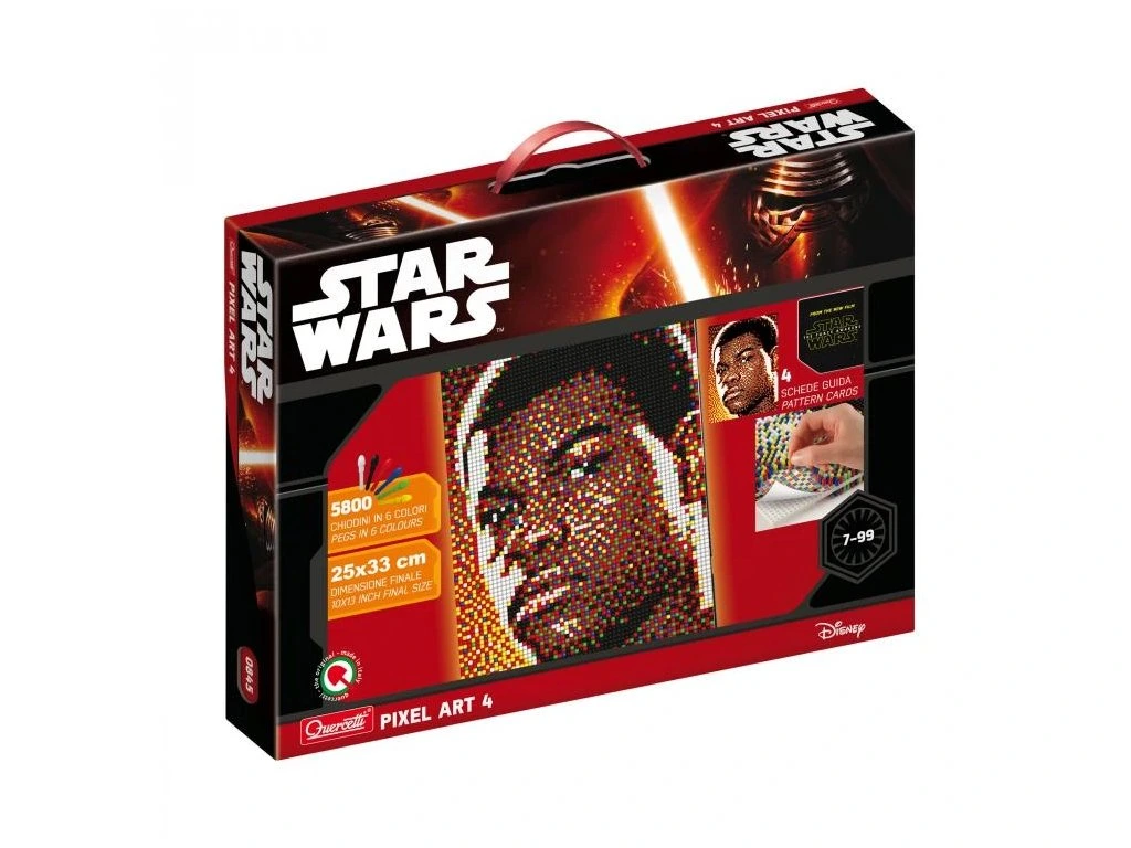Díky Pixel Art si mohou dospělí i děti vytvořit úžasné portréty hrdinů Star Wars pomocí kolíčků značky Quercetti. Vystřihněte vzorové karty, rozložte je na perforované základní desky, vložte kolíčky a sledujte, jak se barvy splynou do detailního obrázku. Tento produkt využívá jev optického míšení barev, inspirovaný pointilismem z 19. století, a poskytuje vizuálně působivý výsledek.