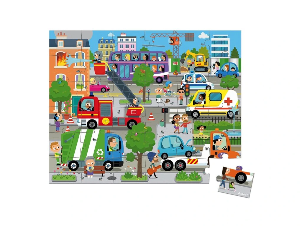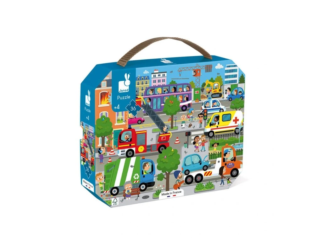 Nádherné puzzle s motivem Město. Tyto kartonové puzzle se 36 ks dílky určitě okouzlí a zabaví nejedno malé dítě. Puzzle jsou balené v originálním a praktickém kufříku se zavíráním, takže jsou vždy uklizené a zároveň jsou pěkným doplňkem do dětských pokojíčků.Součástí balení je i plakát, který se může použít jako šablona.Puzzle rozvíjí logické myšlení, pozornost, paměť, představivost, jemnou motoriku, a zároveň se děti učí vnímat vztah mezi částmi a celkem.