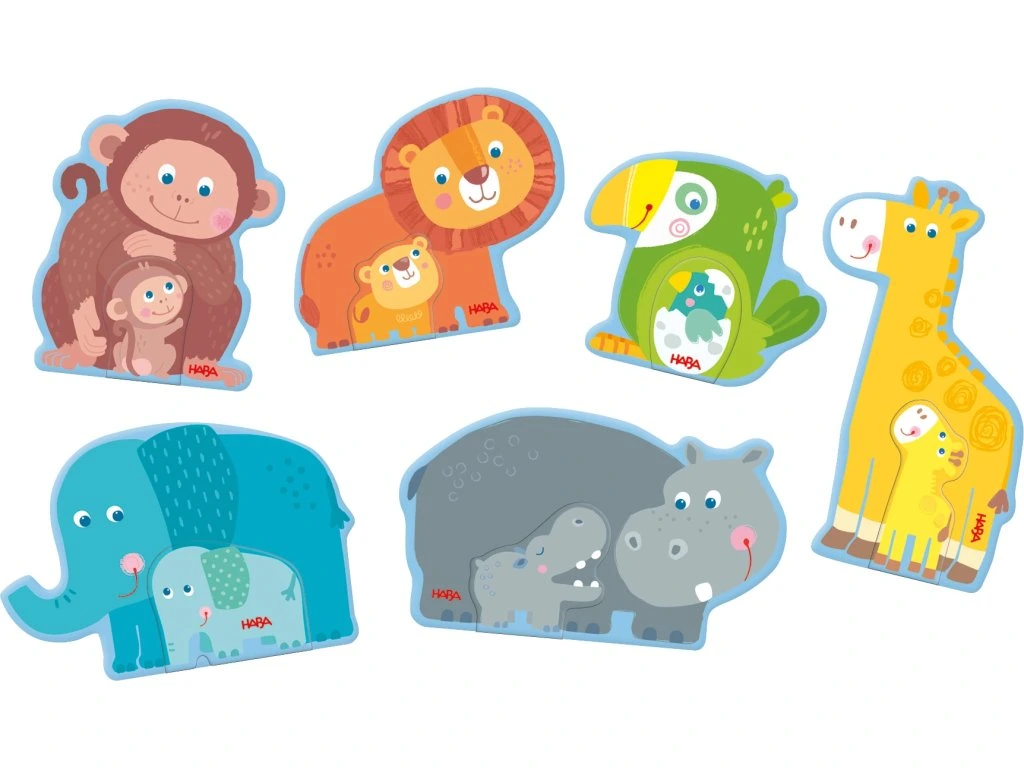 Ideální začátek skládání pro malé milovníky zvířat od 2 let! Děti mohou poskládat mláďata k jejich rodičům – žirafu, nosorožce, papoušek, slona, lva a opičku – a zažít množství zvuků: píp, řev, trúbení!