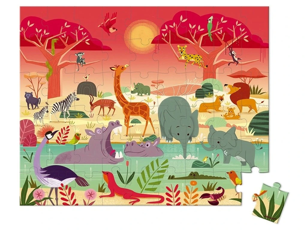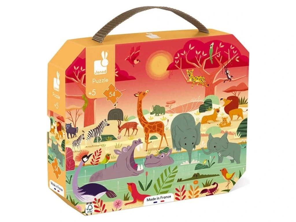 Nádherné puzzle s motivem Savana potěší a zabaví každé malé dítě. Tento 54dílný kartonový set rozvíjí logické myšlení, pozornost, paměť, představivost a jemnou motoriku, přičemž se děti učí vnímat vztah mezi částmi a celkem.