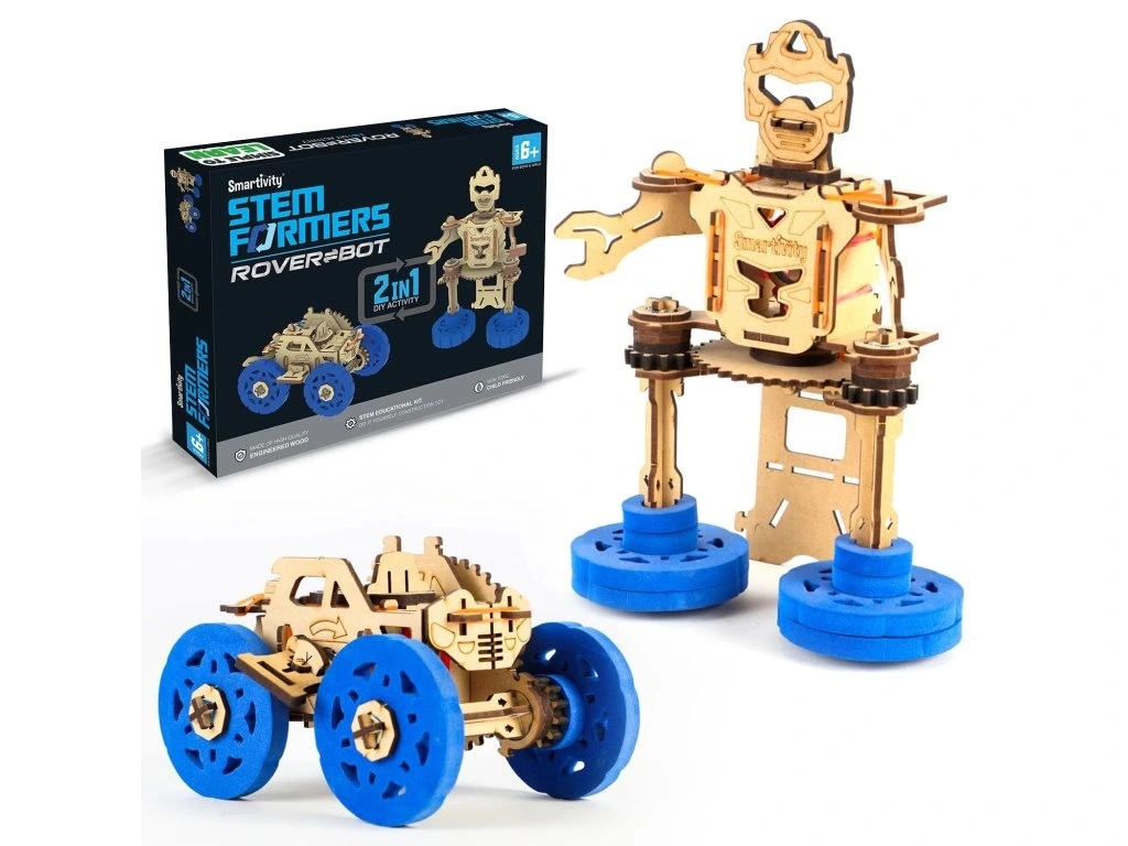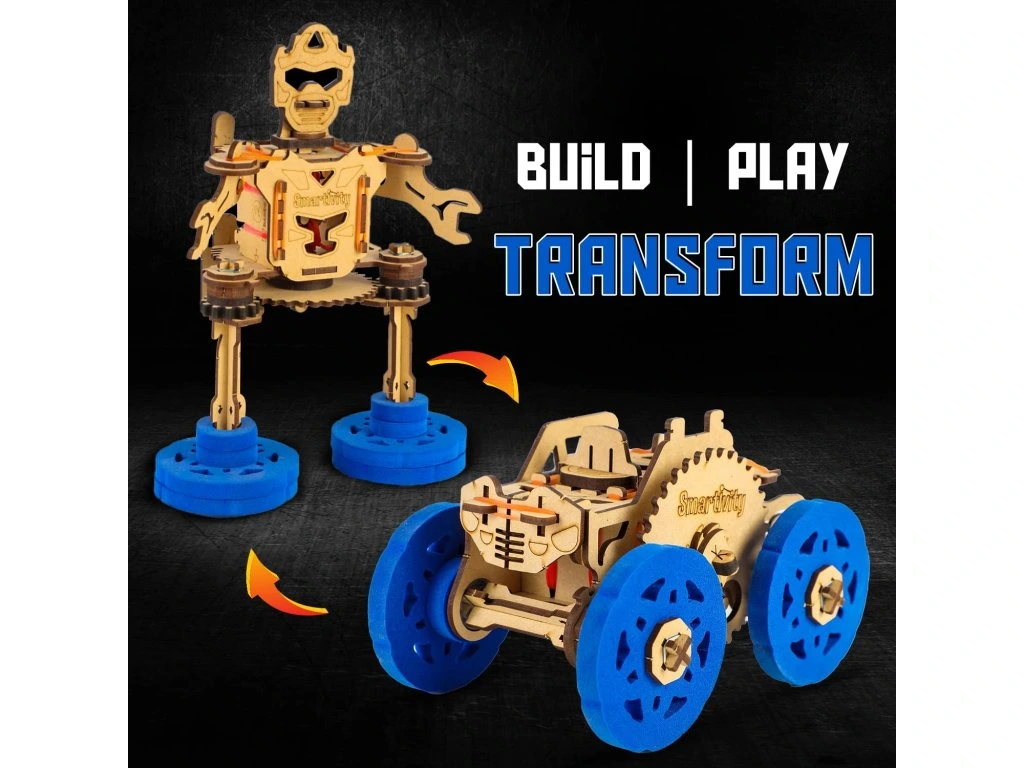 Stavebnice umožňuje sestavit z dřevěných dílů auto i robota.