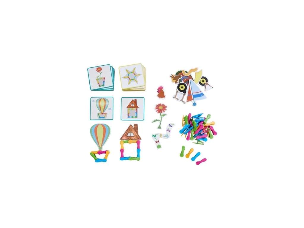 Senzorická hra pro děti na rozvoj jemné motoriky, vizuálního vnímání a představivosti. Prostřednictvím této hry se rozvíjejí úchopové motorické schopnosti. Kolíčky a různé kartonové části mohou být spojovány volně podle vlastní fantazie nebo na základě přiložených kartiček s předlohami.Hra obsahuje 115 částí - 20 kartiček s předlohami (10 se žlutým a 10 s modrým okrajem), 80 barevných kolíčků, 14 kartonových motivů a návod s instrukcemi.