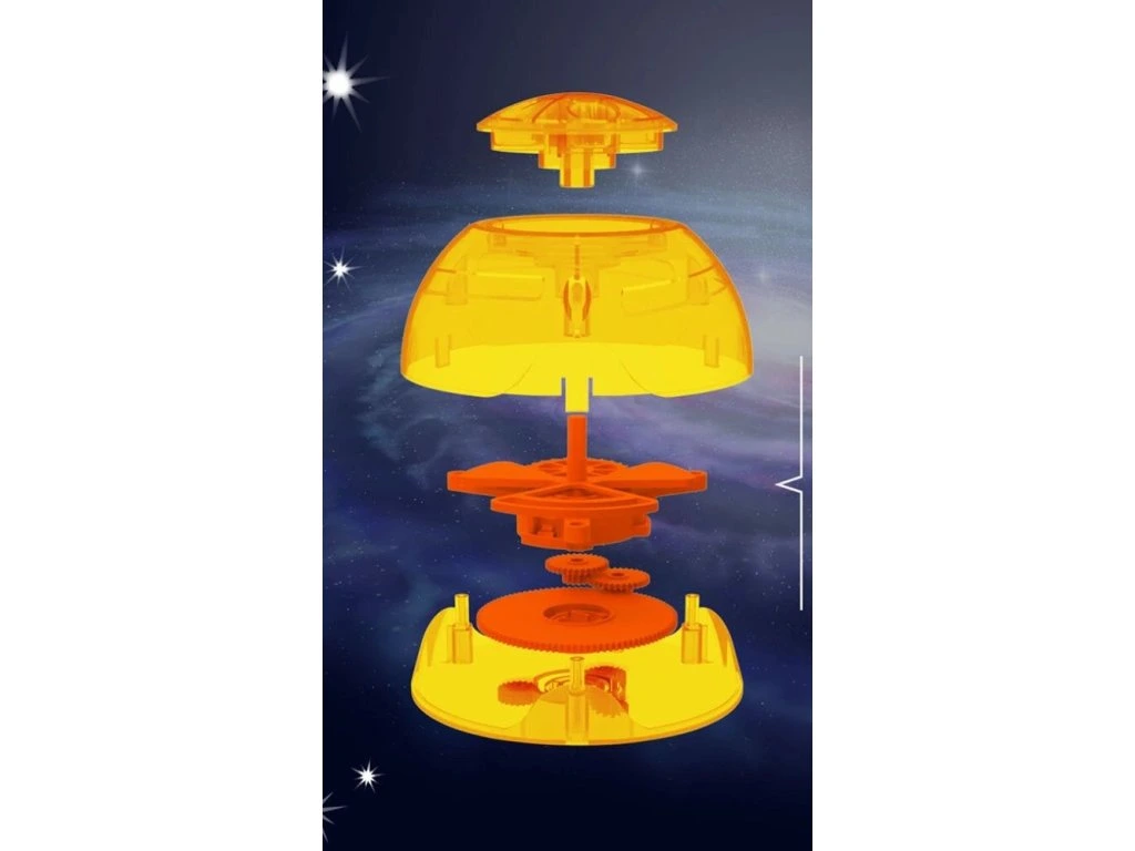 Model se skládá z více než 50 dílů. Děti při konstrukci potrénují jemnou motoriku, představivost i trpělivost. Sluneční koule ukrývá systém natahovacího motorku a převodů z ozubených koleček, které zajišťují pohyb planet. Po správném sestavení převodů je sluneční soustava připravená a planety se pohybují po oběžných dráhách kolem velkého žlutého slunce. Tento model sluneční soustavy pro děti má důmyslně zkonstruovaný natahovací motorek, který zajišťuje rotaci planet kolem slunce, takže nejsou potřeba baterie.