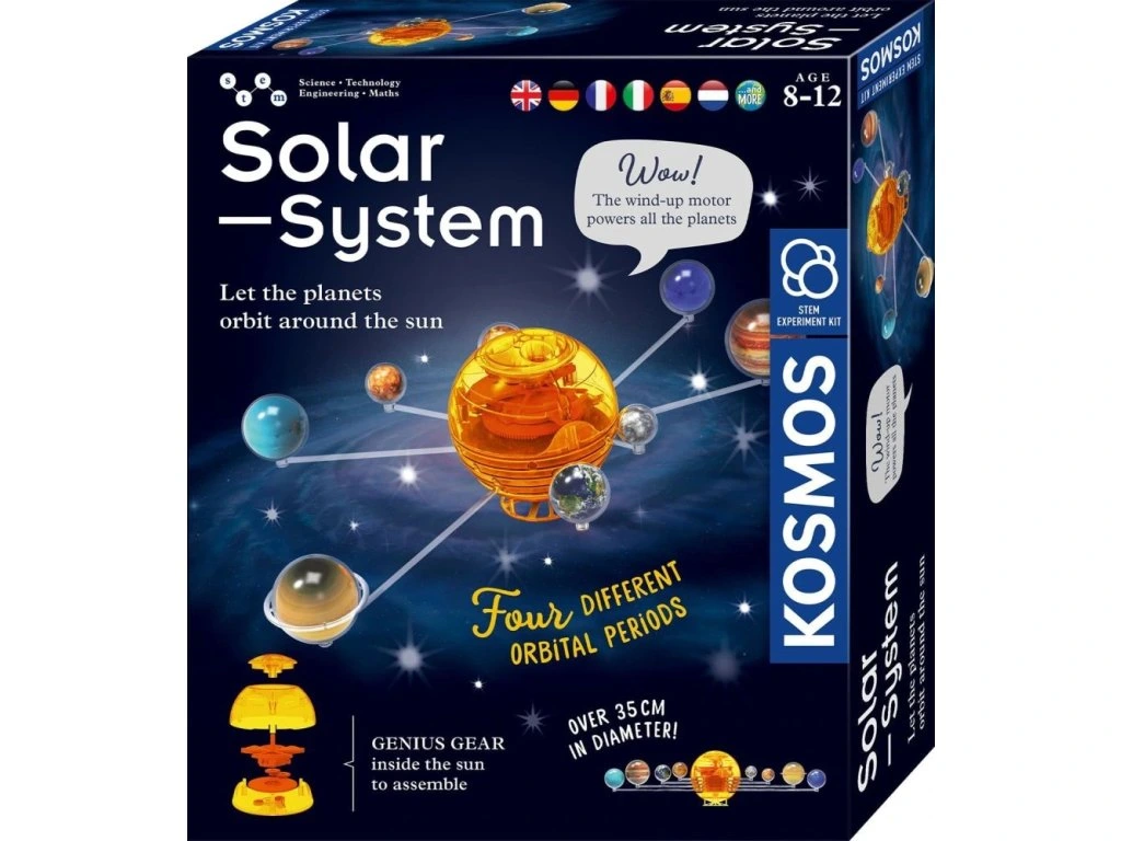 Edukační hračka sluneční soustava pro děti obsahuje 8 planet rotujících kolem Slunce pomocí natahovacího motorku. Solární systém KOSMOS funguje bez jakékoli elektroniky nebo baterií. Po sestavení má sluneční soustava průměr 35 cm a je to skvělá edukační hračka pro děti od 8 do 12 let.