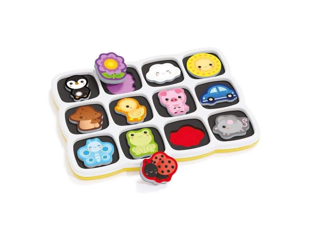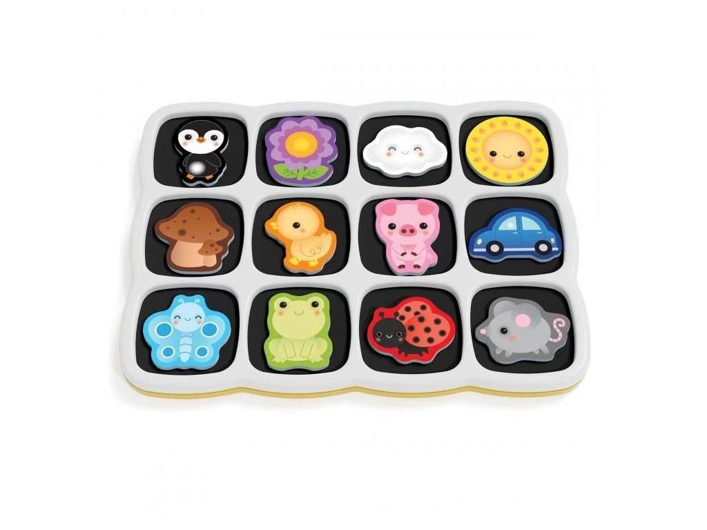- Strana 1 – Puzzle: 12 roztomilých magnetických dílků s jednoduchou grafikou, které děti vkládají na své místo – pomáhá jim rozvíjet schopnost rozpoznávat tvary a prostorové vztahy.
