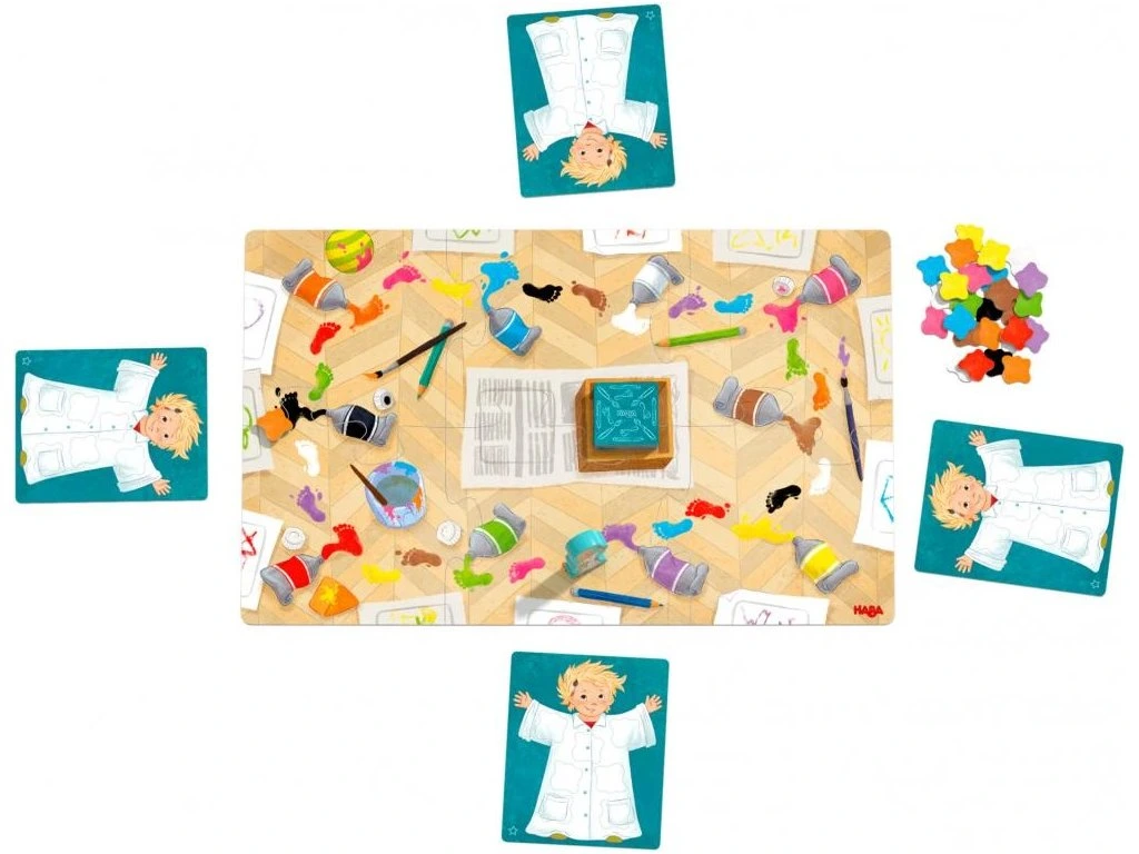 Klecks maluje krásné barevné obrázky, malý malíř potřebuje mnoho barev! Děti přesunují Kleckse z tuby s barvou na další tubu tak, že otočí kartičky s obrázky a pojmenují barvy. V tomto procesu sbíráte barevné skvrny na své pláště. Ale pozor – štěňátko Toffy rádo krade štětce! Vyhrává hráč, který jako první nasbírá sedm barevných fleků na svůj malířský plášť.Doplňkové parametry