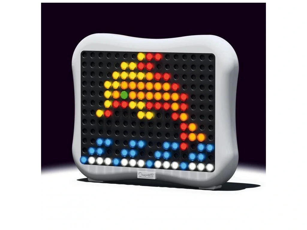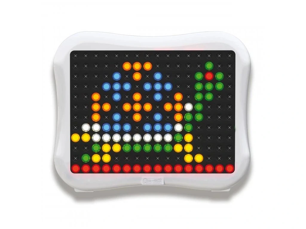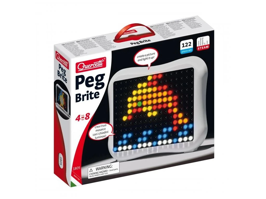 Quercetti Peg Brite je svítící mozaiková hračka, která rozzáří každý dětský pokoj a podpoří kreativitu. Díky kolíčkům mohou děti tvořit zářící obrázky a vzory na moderním plochém displeji se zaoblenými okraji. Originální design displeje umožňuje dětem vytvářet obrazy bez omezení jejich tvůrčí svobody. Peg Brite kombinuje klasickou mozaiku s moderní technologií, čímž poskytuje jedinečný zážitek ze hry.Světlo generují LED diody nejnovější generace, které nabízejí vysoký jas a nízkou spotřebu energie. Kolíčky, připomínající malé lampičky, jsou vyrobeny z krystalického materiálu, který se třpytí i bez zapnutého napájení, a snadno se zasunují do otvorů displeje. Součástí balení je také album s 12 inspirativními předlohami, které mohou sloužit jako návod nebo zdroj inspirace.