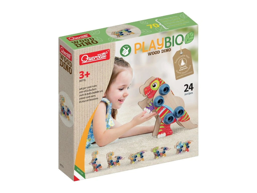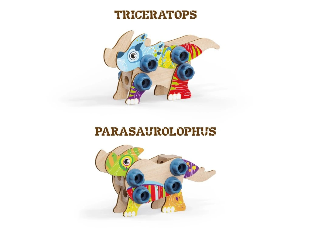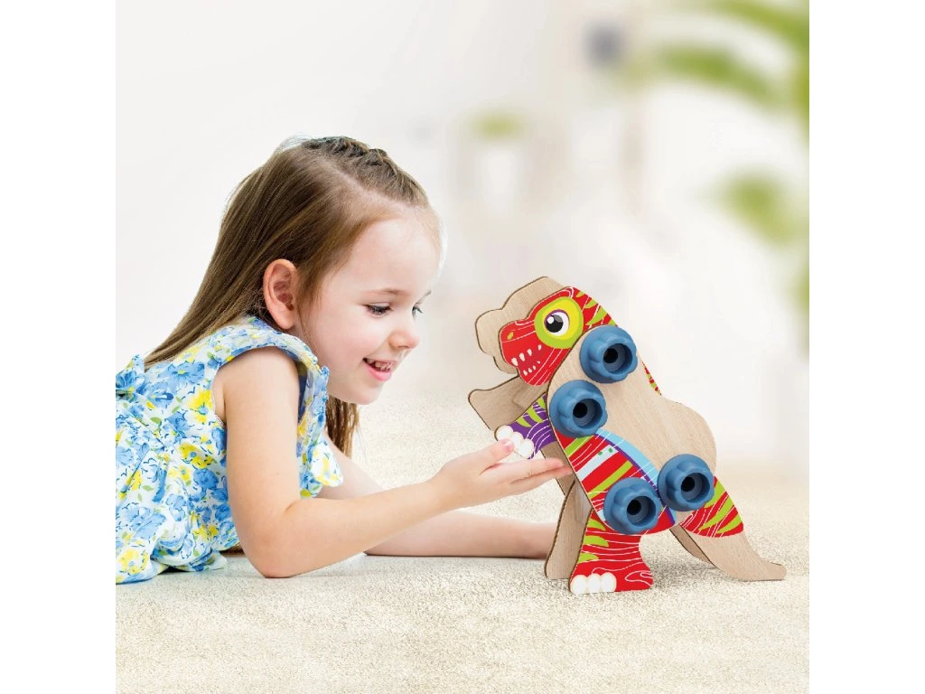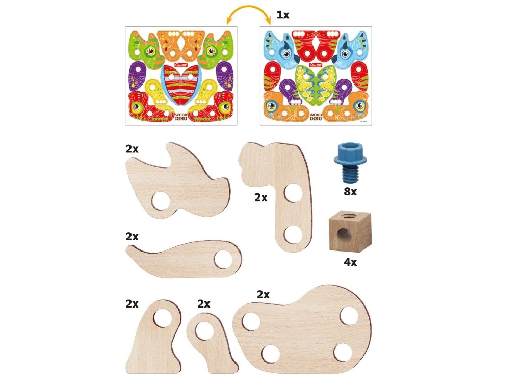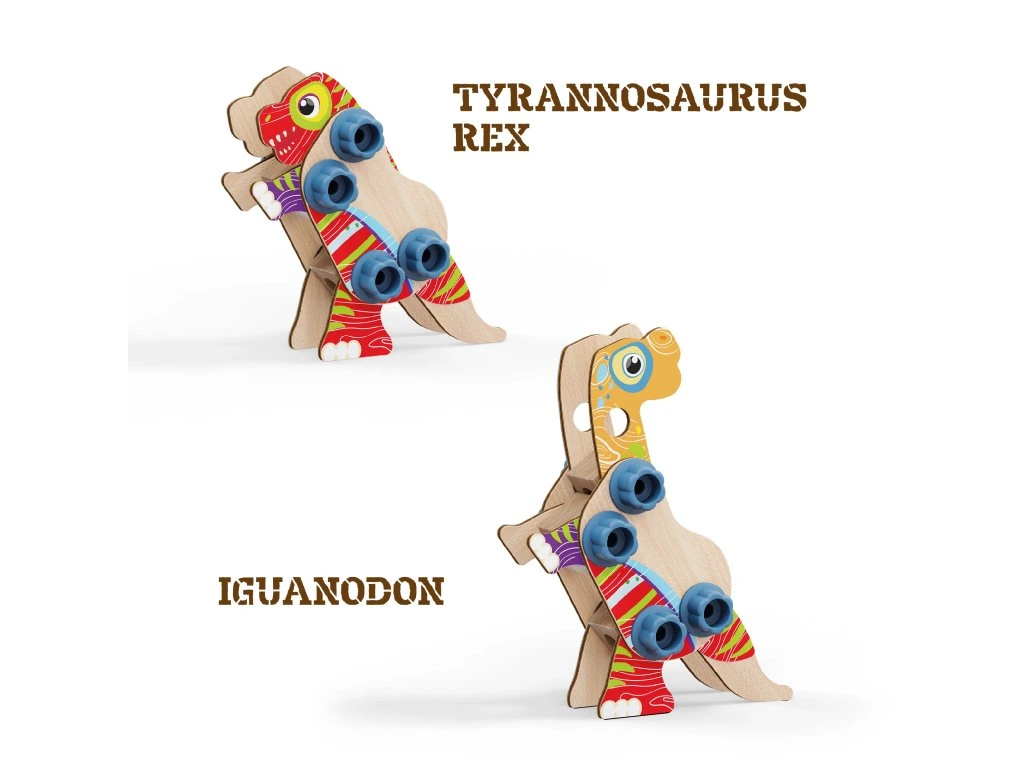 Tato souprava umožňuje dětem tvořit nejrůznější typy dinosaurů pomocí dřevěných tvarů a bio-plastových šroubků a matic. Po sestavení si mohou svoje výtvory ozdobit podle vlastní nálady a fantazie. Hračka spojuje zábavu s ekologickou udržitelností a je vhodná pro děti od 3 let.Obsah balení:
