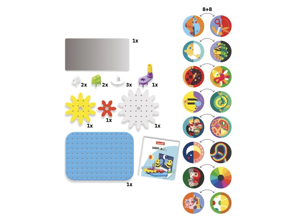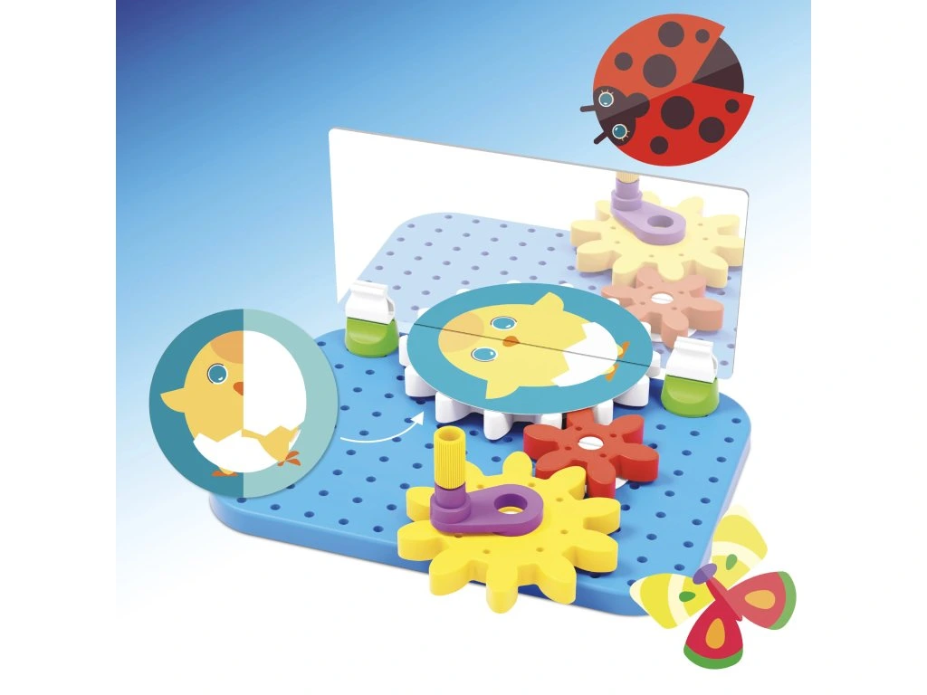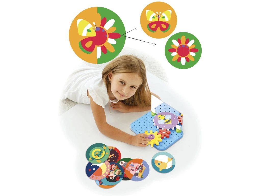 Mirrorello je hravé a kreativní dobrodružství, které mění každé otočení ozubených koleček na fascinující vizuální kouzlo! Jednoduchým otočením kliky se ilustrované kotouče magicky pohybují a vytvářejí překvapivé, stále nové obrazy. Tato hračka rozvíjí jemnou motoriku, schopnost řešit problémy a pomáhá dětem pochopit principy příčiny a následku.Obsah balení: