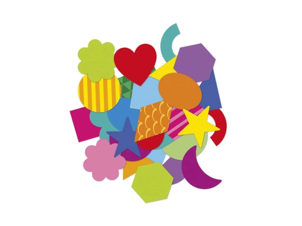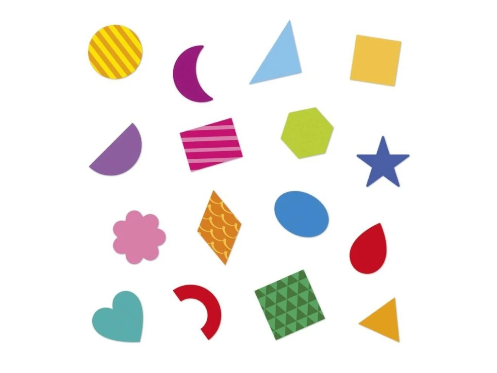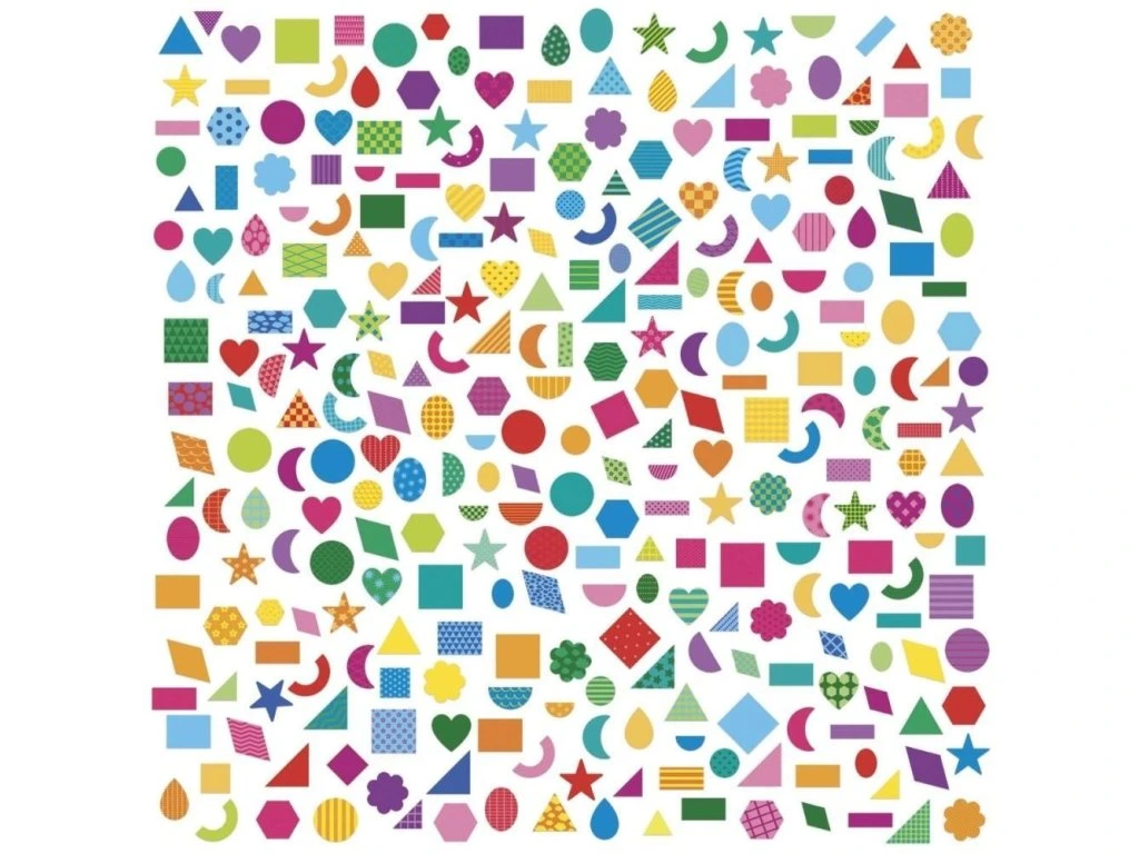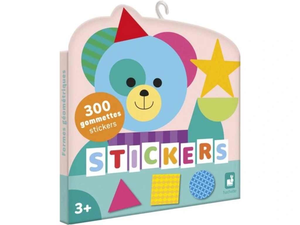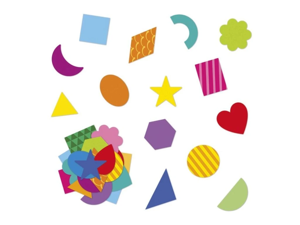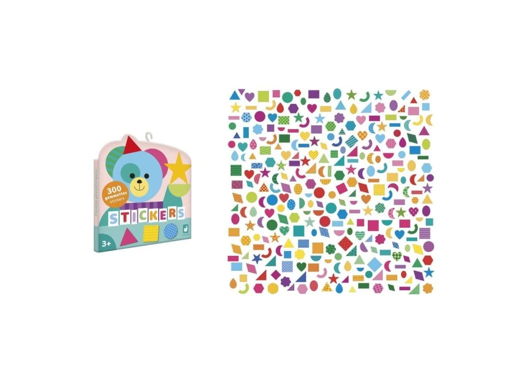 Sada nálepek Geometrické tvary francouzské značky JANOD obsahuje 300 opakovaně použitelných, obrysově vyřezaných nálepek.