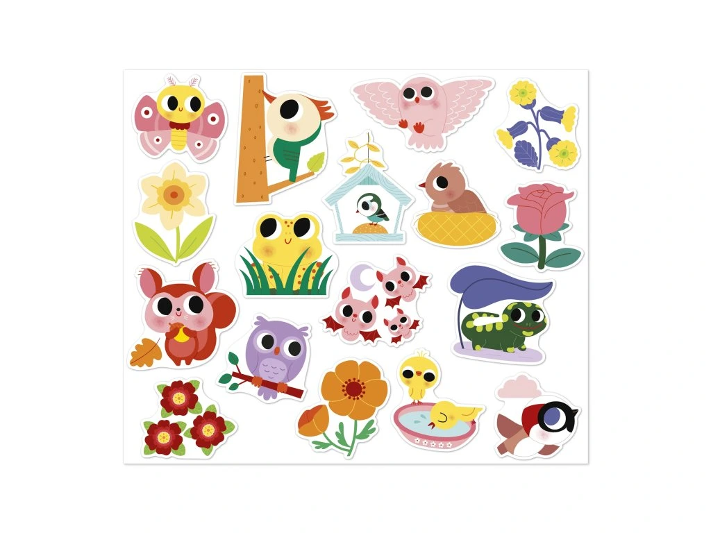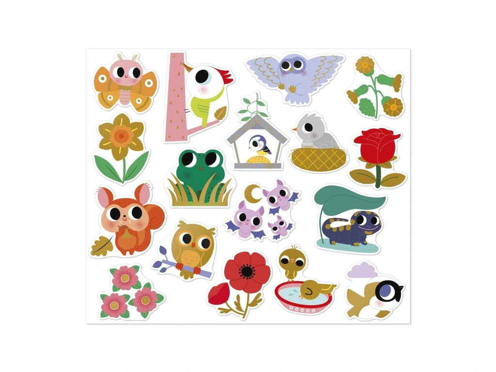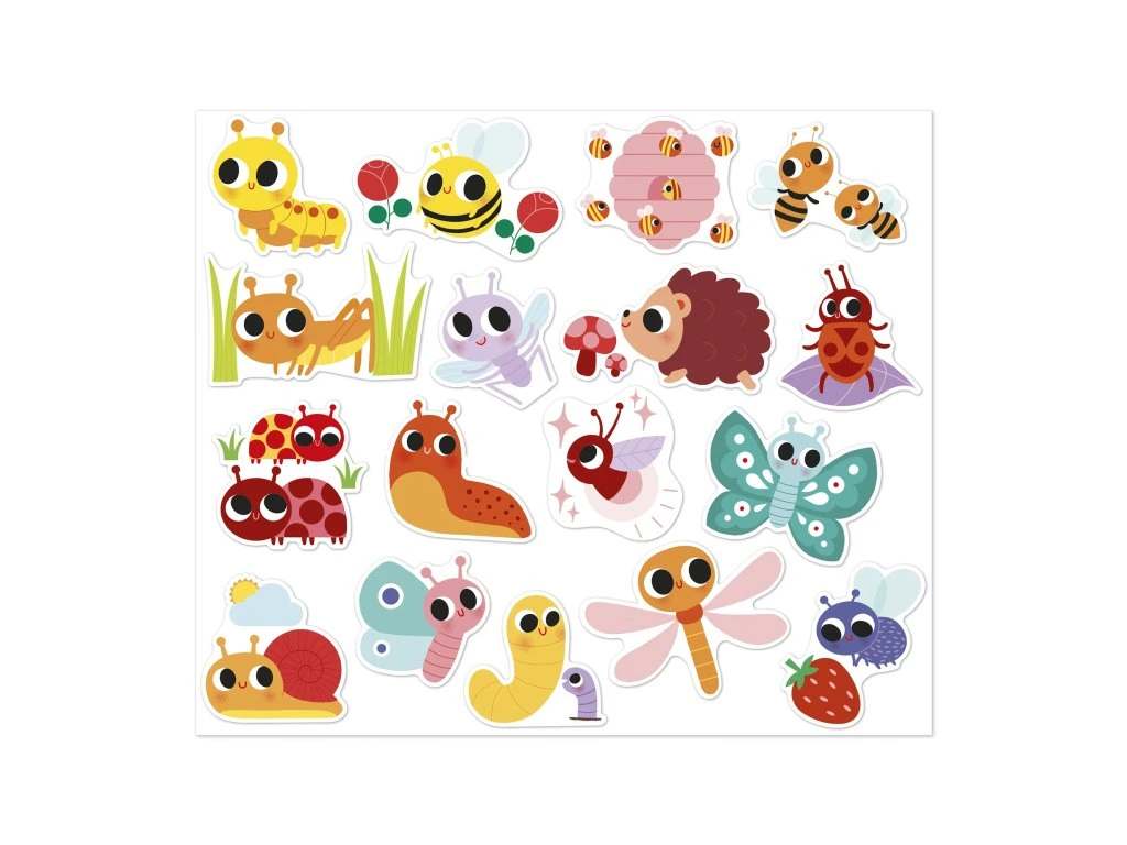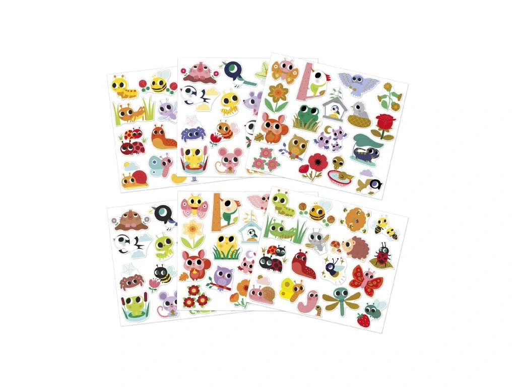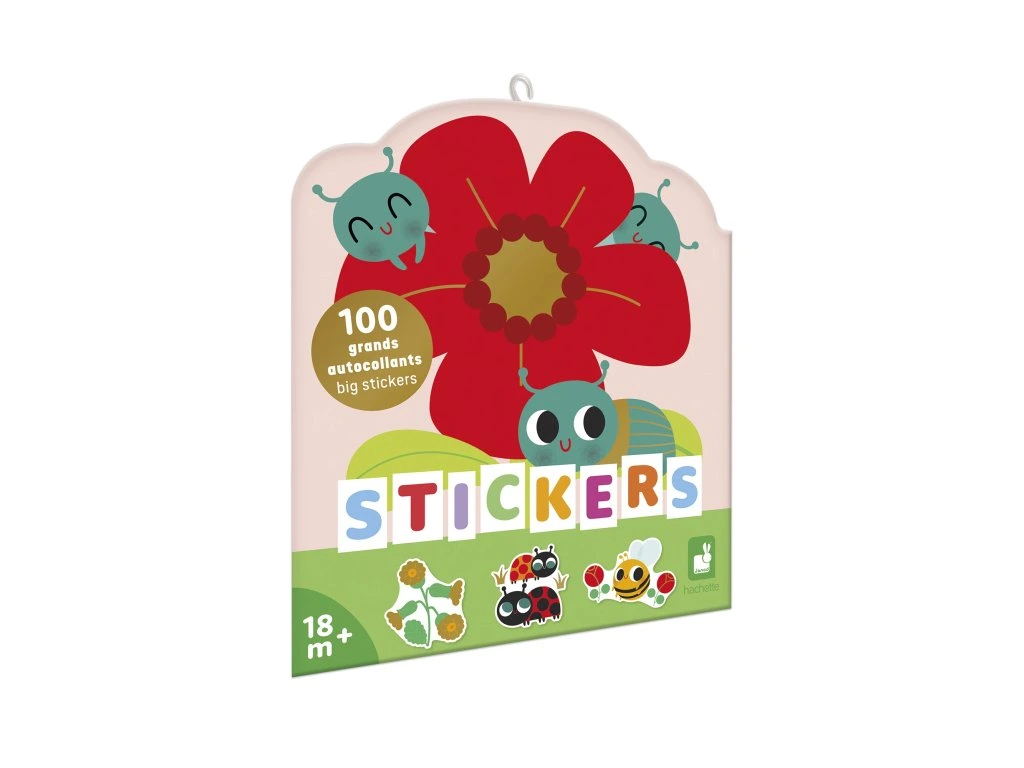 Na přední straně knížky jsou květy a roztomilé housenky. Nálepky bez ořezávání perfektně sedí na 6 listů, každý list obsahuje 16 nálepek. Na 2 listech jsou použity efekty zlaté fólie, které dodávají aktivitě extra lesk a hravost. Nálepky byly speciálně navrženy pro ruce dětí od 18 měsíců, přičemž každý list má rozměry 20 x 17 cm.
