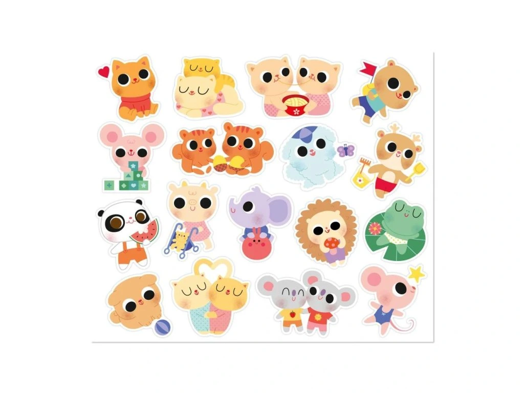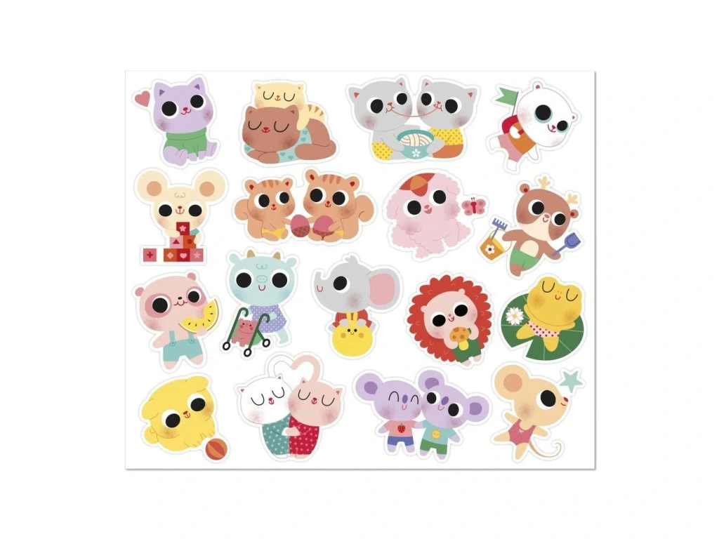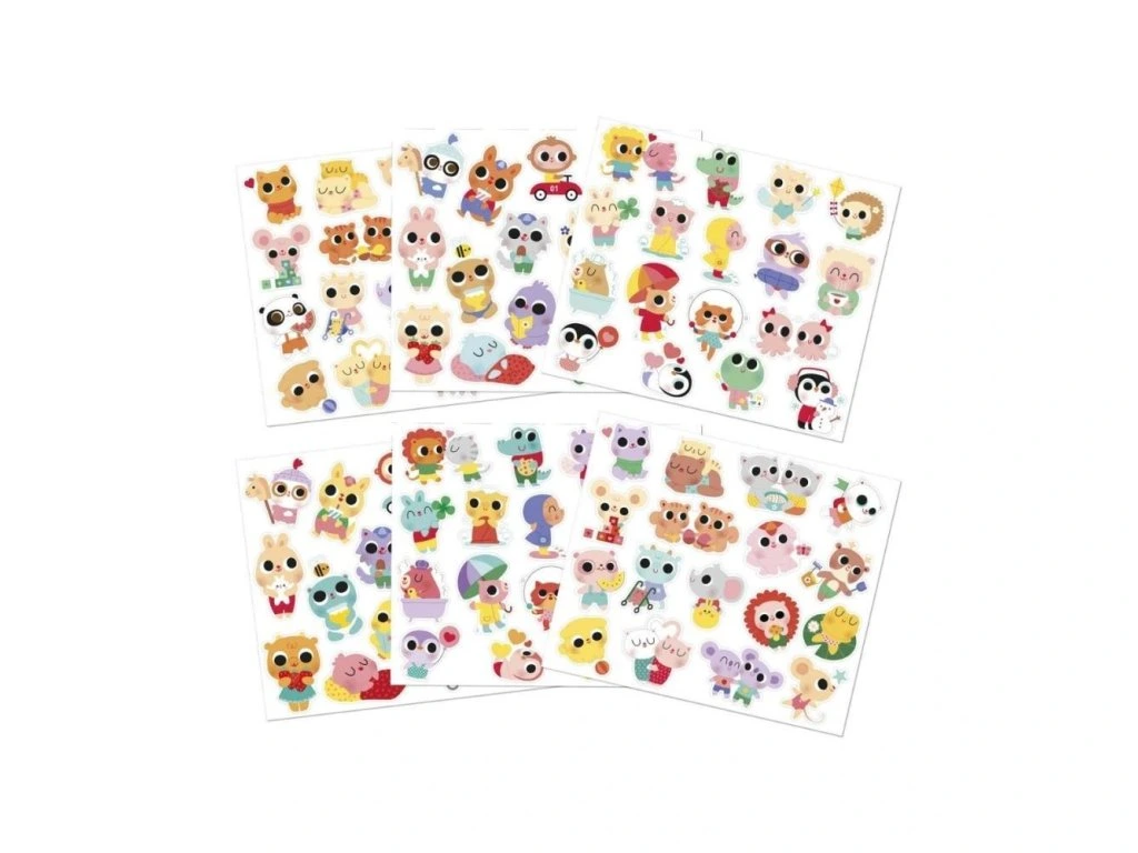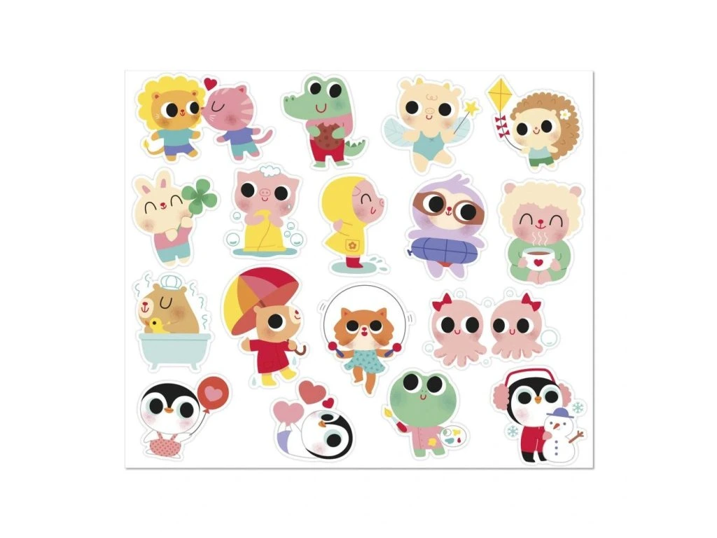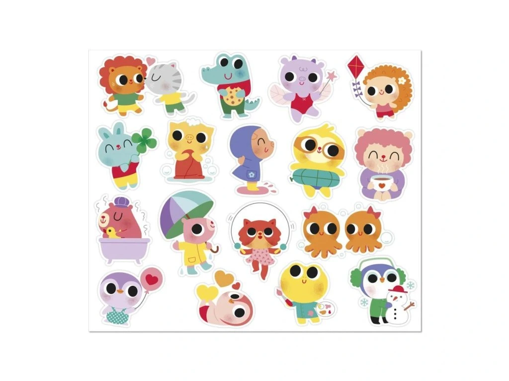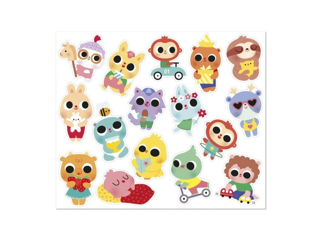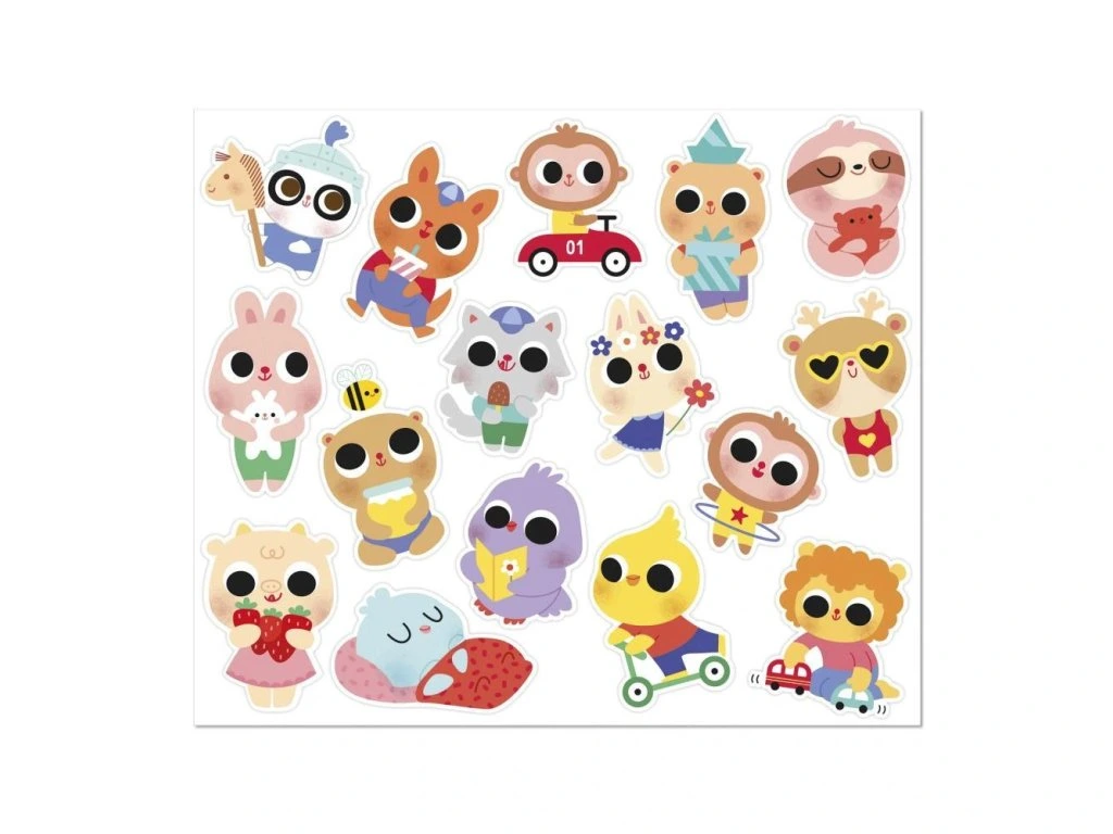 Nálepky jsou rozložené na 6 listech (17 x 20 cm každý) a vhodné pro děti od 18 měsíců – mají optimální velikost pro malé ručičky. Zobrazují roztomilé scénky ze života mladých zvířátek, například kapybaru ve vaně, kuřátko na koloběžce nebo ježka pouštějícího draka. Polovina nálepek má lesklý kovový povrch, který jim dodává jedinečný šarm.