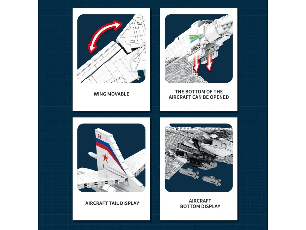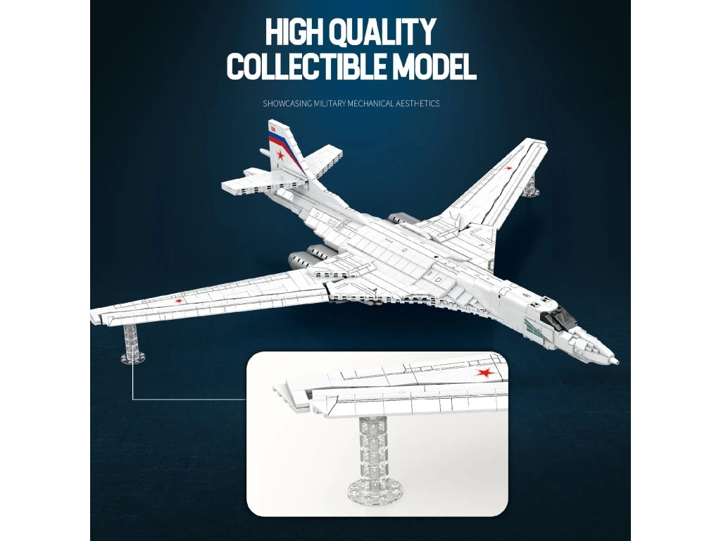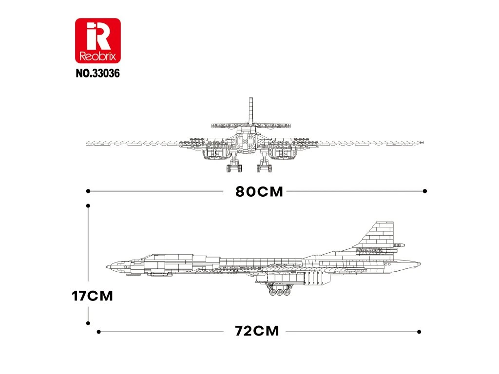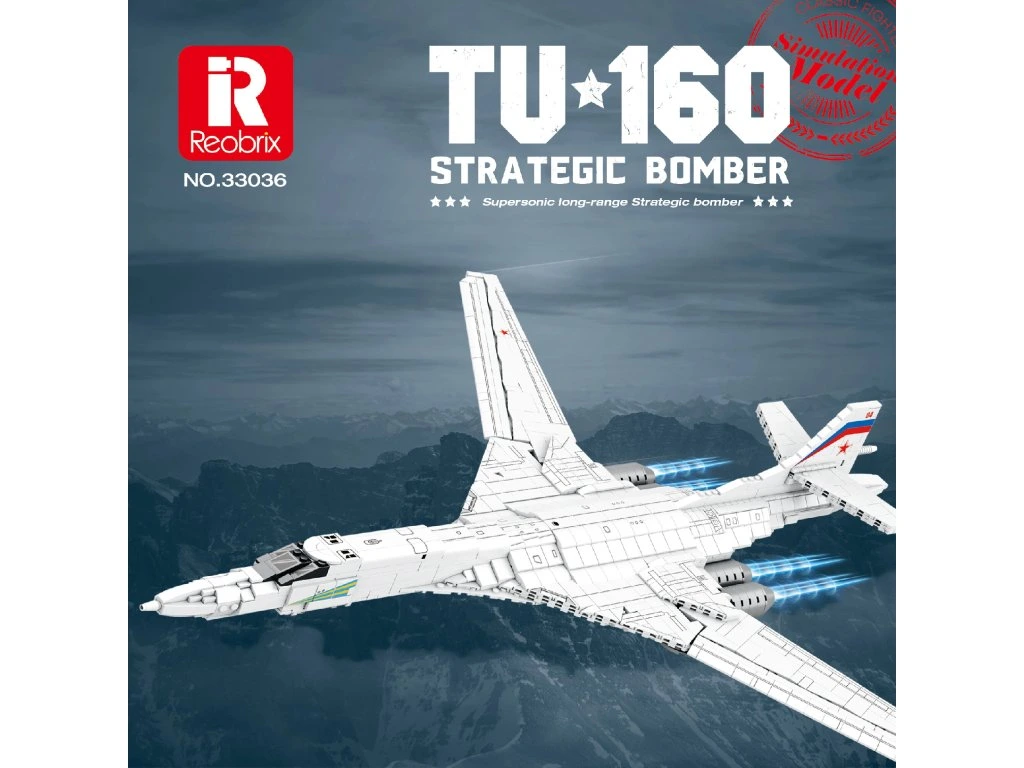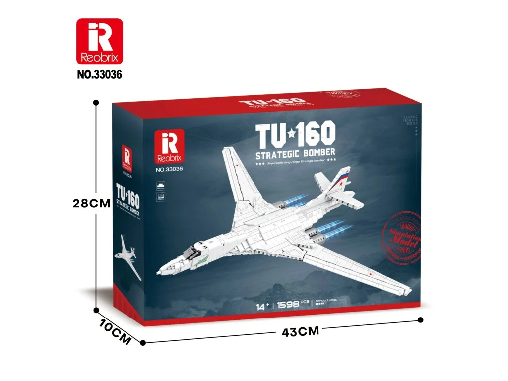 Stavebnice Reobrix 33036 Bombardér TU-160 je rozsáhlý technický model inspirovaný nadzvukovým strategickým bombardérem Tupolev TU-160 „Bílá labuť" (bez licence) – jedním z největších a nejrychlejších bombardérů na světě. Model zaujme elegantní siluetou, promyšlenou konstrukcí a působivými rozměry, díky kterým se stane dominantou každé sbírky.