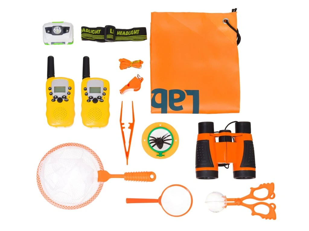 Obsah soupravy: Binokulární dalekohled, Vysílačky – 2 ks, Čelovka, Dynamo svítidlo, Lupa na rukojeti, Nádobka s lupou, Kompas, Lapač hmyzu, Pinzeta, Síť na motýly, Píšťalka, Batoh, Návod k použití a záruční list