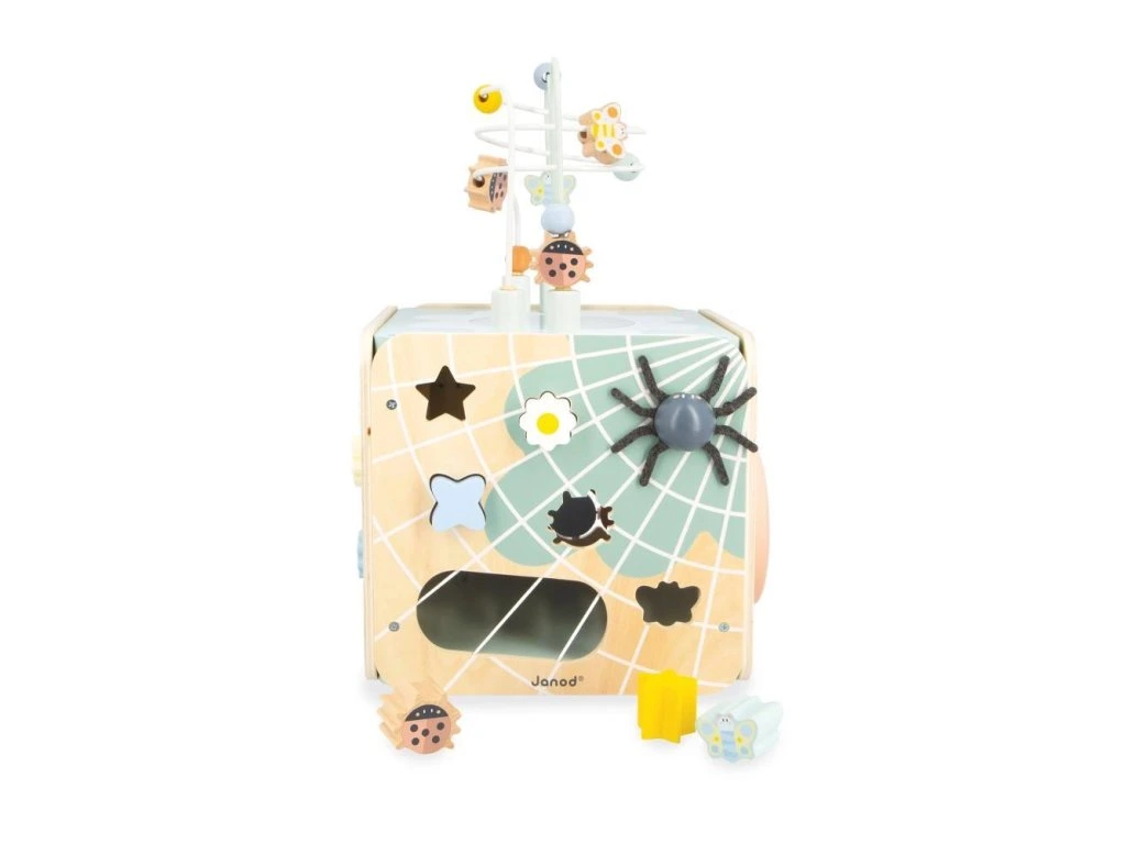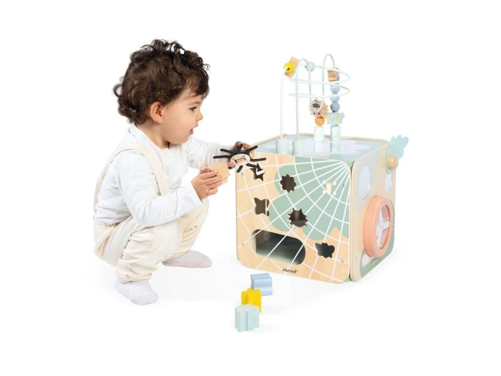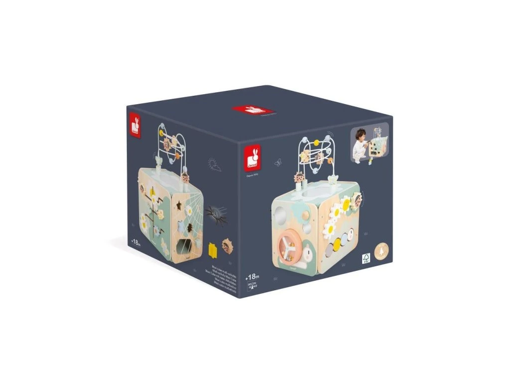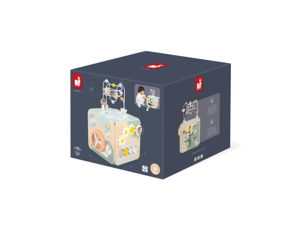 Tato aktivní kostka podporuje manipulační schopnosti, objevování a zvědavost dětí. Díky různým tvarům, zvukům, materiálům a přírodnímu dřevu se miminko učí každý den nové věci. Vyrobená ze dřeva s certifikátem FSC™ a barvami na vodní bázi, součást kolekce Sweet Cocoon. Vhodná pro děti od 18 měsíců.