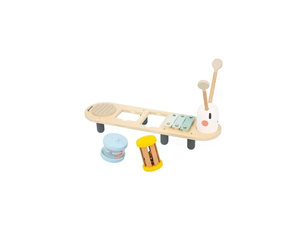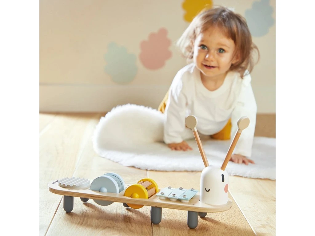 Do Re Mi…. toto je obzvláště zábavná housenka! Nechte dítě experimentovat a objevovat každou část těla této hudební housenky. Hudební stoleček obsahuje 5 hudebních nástrojů a podporuje rozvoj hudebního a zvukového smyslu dítěte. Hračka je vyrobená ze dřeva s certifikátem FSC™ a má jemné přírodní barvy.