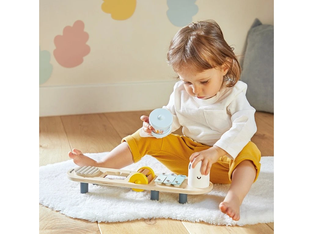 Hudební stoleček umožňuje dítěti chrastítka točit na podstavci nebo s nimi třást nahoru-dolů. Ideální pro objevování zvuků a experimentování s hudbou už od nejútlejšího věku.