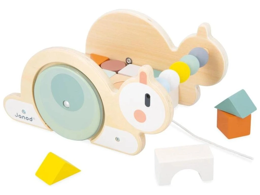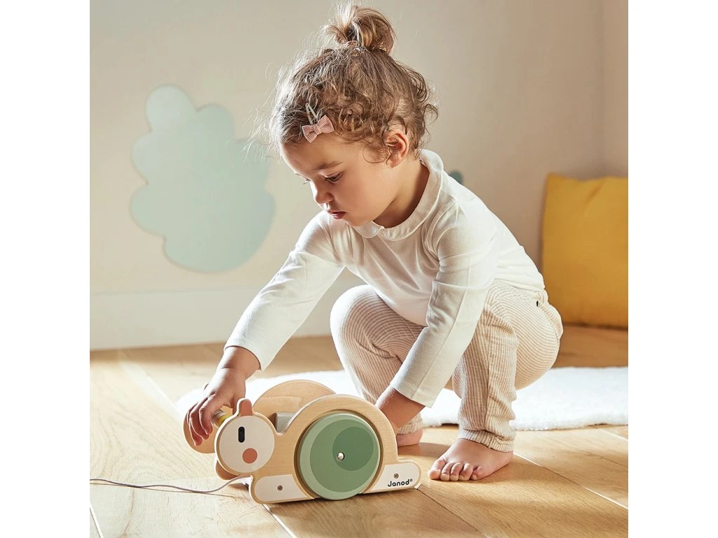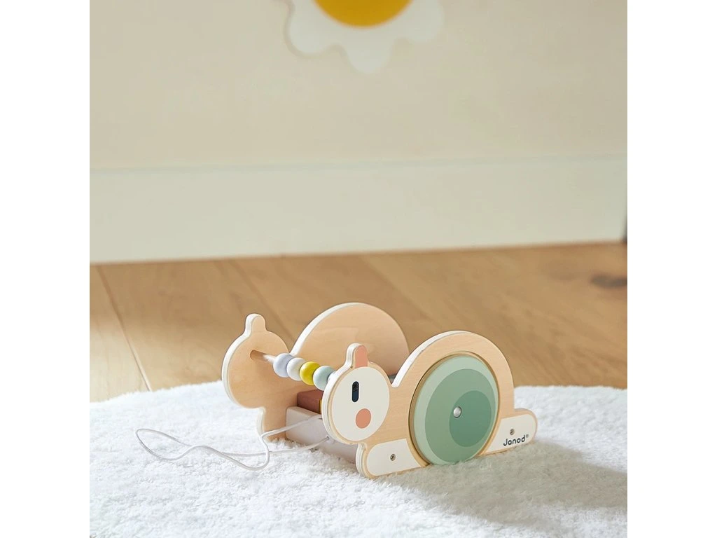- Tahací dřevěná hračka ve tvaru šneka s otáčející se ulitou
