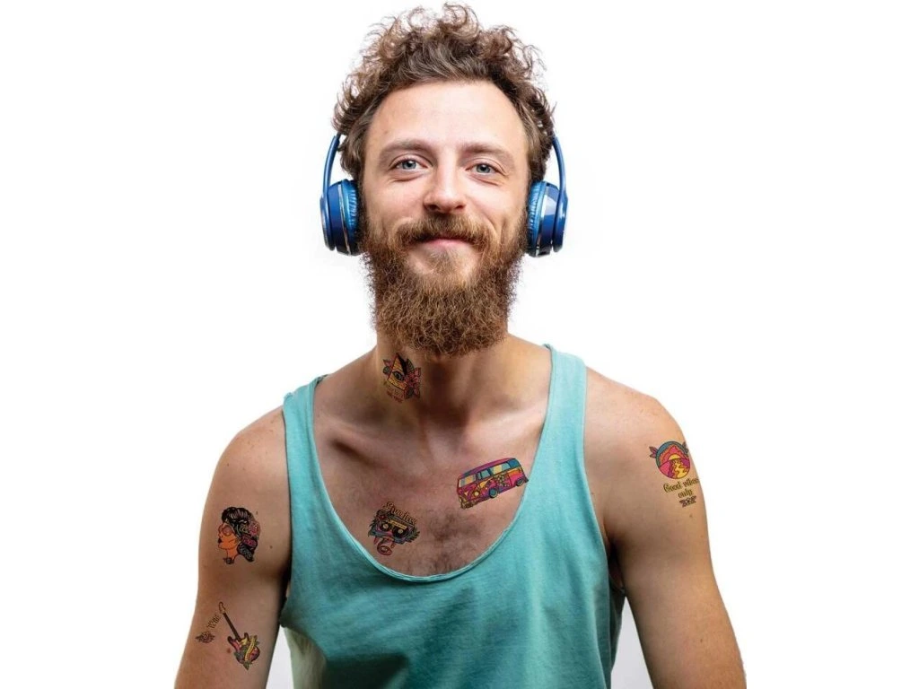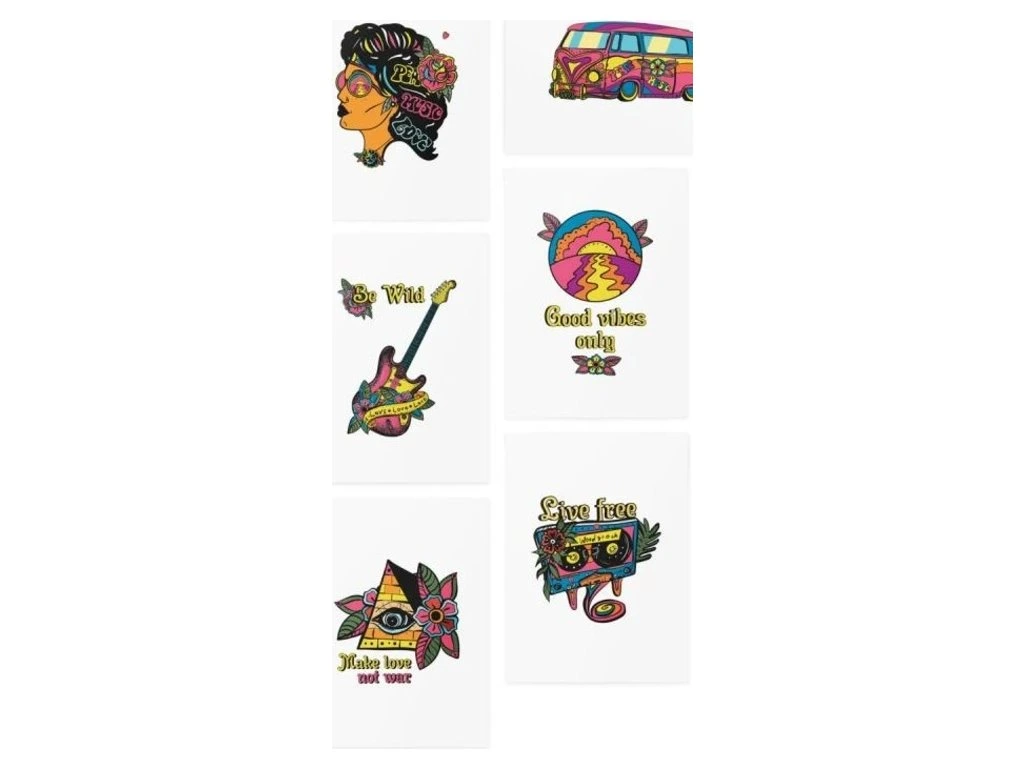 Láska, mír a trocha nostalgie, to je to, co tvoří tento tetovací set. Design ve stylu 60. let bude vyhovovat vašemu vzhledu hudebního festivalu, tematické kancelářské party nebo jen tak v horkém letním dni. Nezapomeňte se o jedno nebo dvě tetování podělit s přáteli!