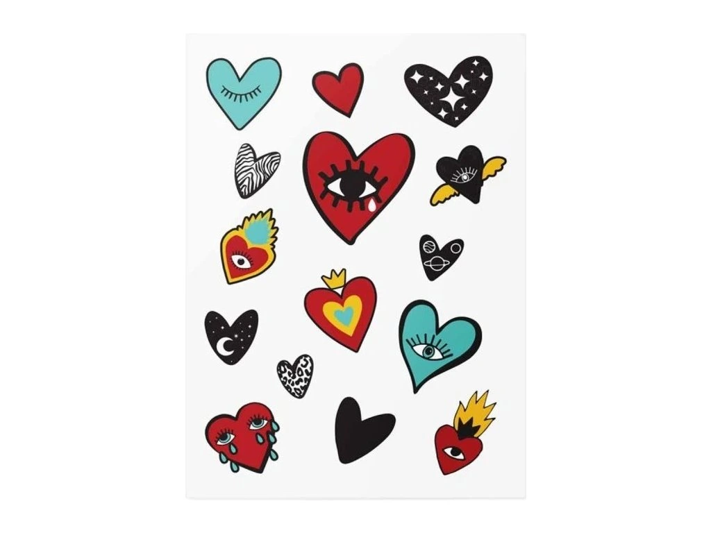 Jak můžeme být královnami srdcí, aniž bychom ukázali jediné? Naše skvělá tetování ve tvaru srdce se vám přilepí pouze tehdy, pokud jste do někoho zamilovaní. Haha! Nebo ne? Stříhejte a kombinujte tetování jakýmkoli způsobem.