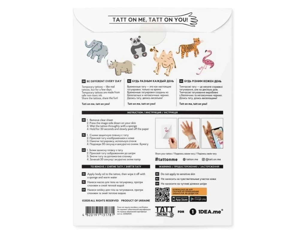 Hledáte ještě něco zajímavějšího, než běžné tetování pro děti? Živé tetovačky to vyřeší za vás! Jste dnes Panda, Tygr, Plameňák, Slon, Nosorožec nebo Velbloud? Hrajte a učte se s asijskými živými tetováními zvířat. AR kolekce ekologických tetovánek se zvířátky ze všech koutů světa. Po stažení aplikace oživnou na vašem těle a řeknou vám po anglicky, jak se jmenují. Skvělá pomůcka na učení anglických názvů zvířátek zábavnou formou!