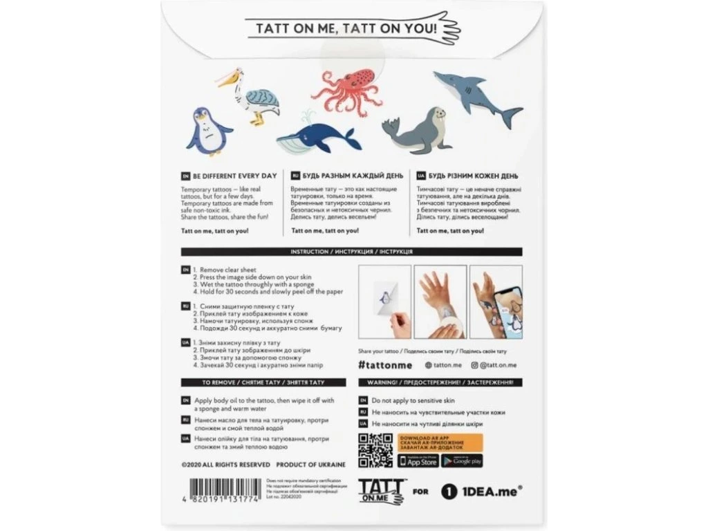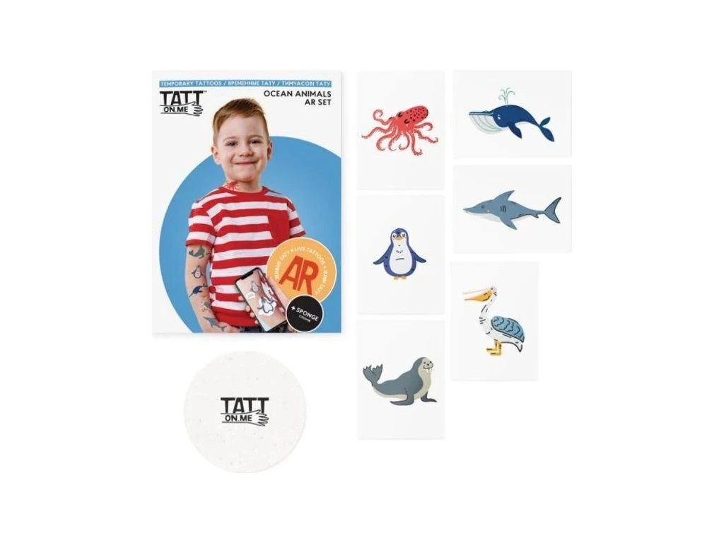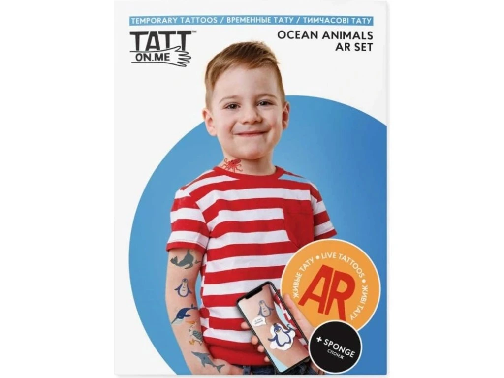 Hledáte ještě něco zajímavějšího, než běžné tetování pro děti? Živá tetování to vyřeší za vás! Kdo se umí nejlépe potápět? Jsou to naše oceánská zvířata z dočasných tetování. Dejte si je na kůži a oživte je! Děti budou zaručeně z toho celé 'WOW!'. AR kolekce ekologických tetování se zvířátky ze všech koutů světa. Po stažení aplikace ožijí na vašem těle a řeknou vám anglicky, jak se jmenují. Skvělá pomůcka na učení anglických názvů zvířátek zábavnou formou!