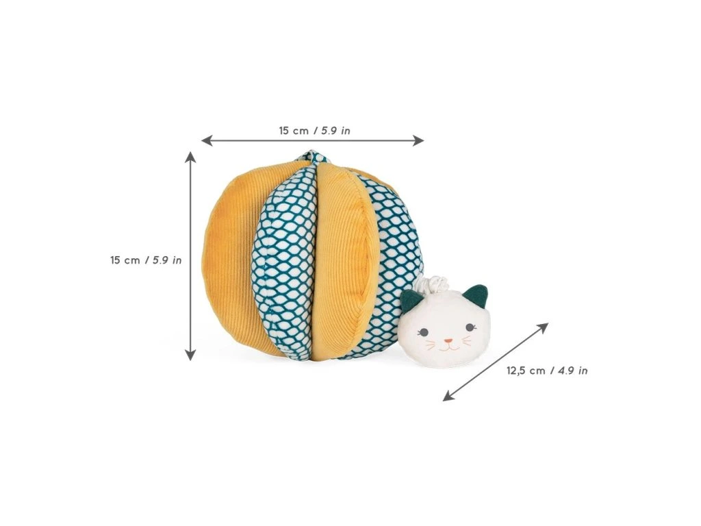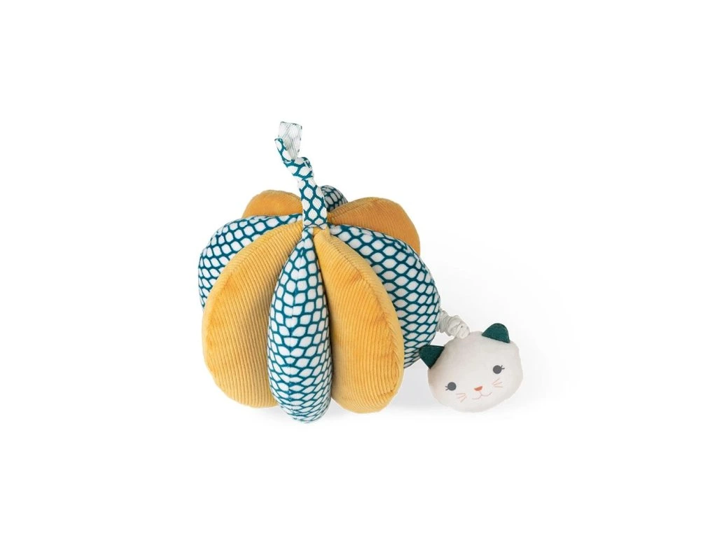 Tato textilní lopta s aktivitami, vyvinutá a vyrobená ve spolupráci s psychomotorickými terapeuty, je ideální na rozvoj jemné motoriky dítěte. Měkká, plyšová a látková lopta byla speciálně navržena tak, aby vyhovovala malým ručičkám. Její jednotlivé části ve tvaru okvětních lístků usnadňují uchopení, přičemž okamžitě zlepšují základní motoriku miminka. Jak dítě roste, tato lopta postupně pomáhá rozvíjet i jemnou motoriku.Tahání za kočičí hlavu rozvibruje loptičku, což poskytuje dítěti nový smyslový zážitek. Lopta je umyvatelná, což umožňuje vzít ji sebou všude a udržet ji čistou pro dítě.