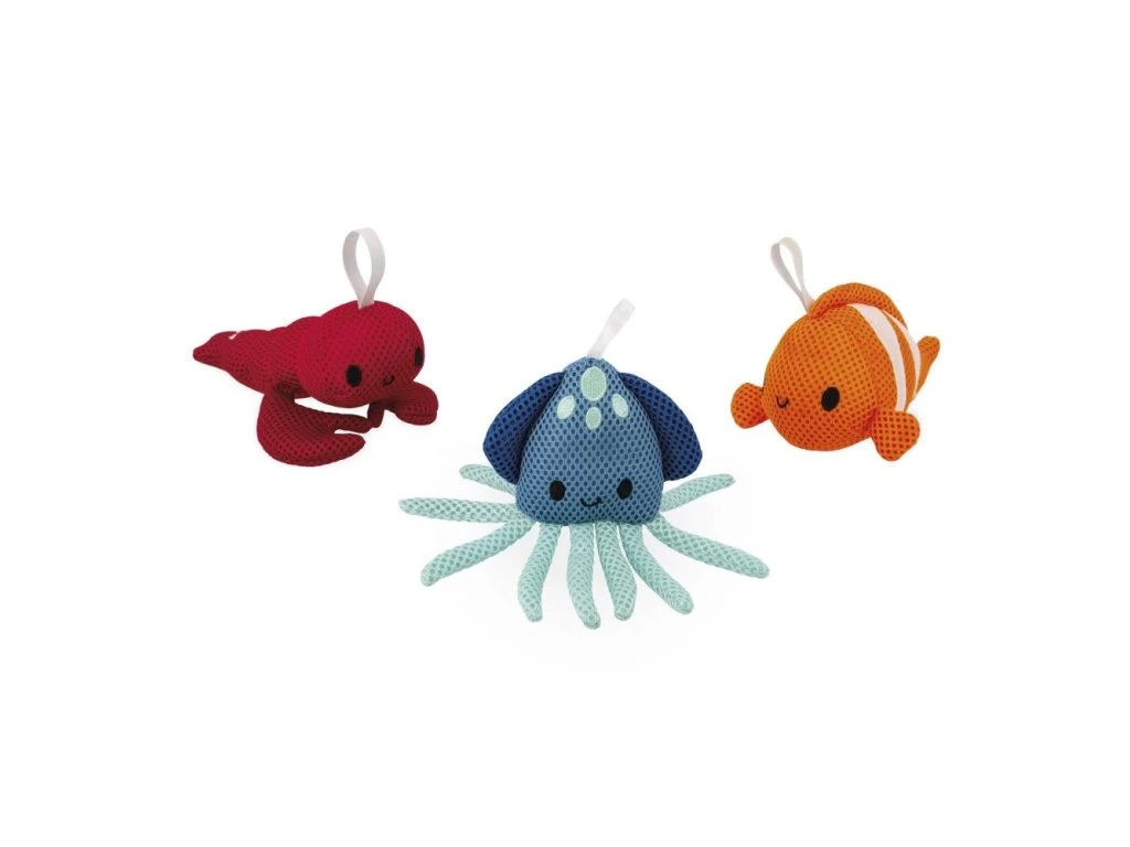 Pomozte svému dítěti na cestě k samostatnosti s těmito krásnými houbičkami do koupele! Balení obsahuje: 3 mořské živočichy: humr, rybička klaun a chobotnice. Jednoduše je namočte a přidejte trochu mýdla, aby napěnily. Tyto houbičky do koupele, vhodné pro ručičky nejmenších, vám pomůžou naučit vaše dítě umývat se formou zábavy.Hračka do vany pro děti od 10 měsíců.