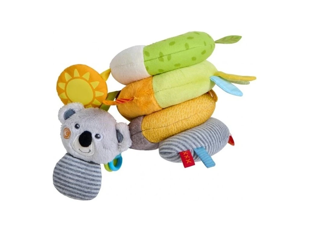 Pestrobarevná spirála s aktivitami se dá stočit například kolem rukojeti dětské autosedačky, aby se vaše dítě dobře zabavilo na dlouhých cestách autem. Dá se omotat i kolem tyče postýlky. Tato roztomilá koala zaměstná malé průzkumníky různými zvukovými efekty, jako je chrastítko, pískání či praskání fólie.