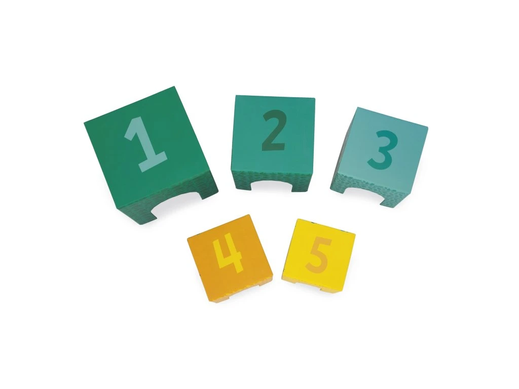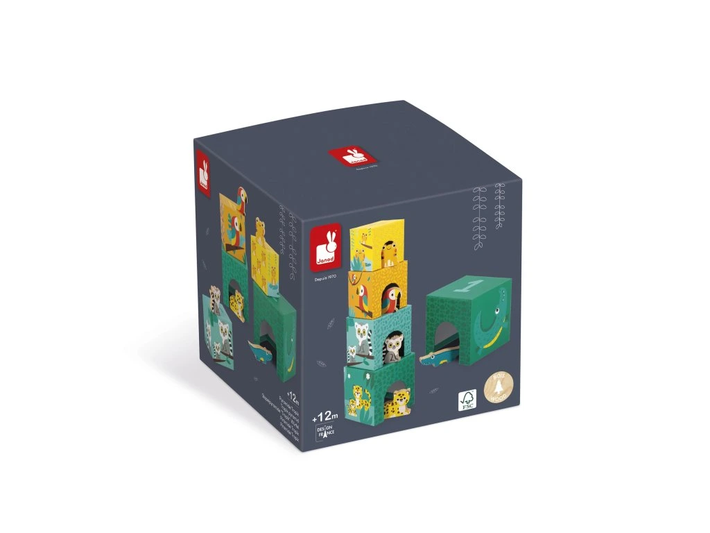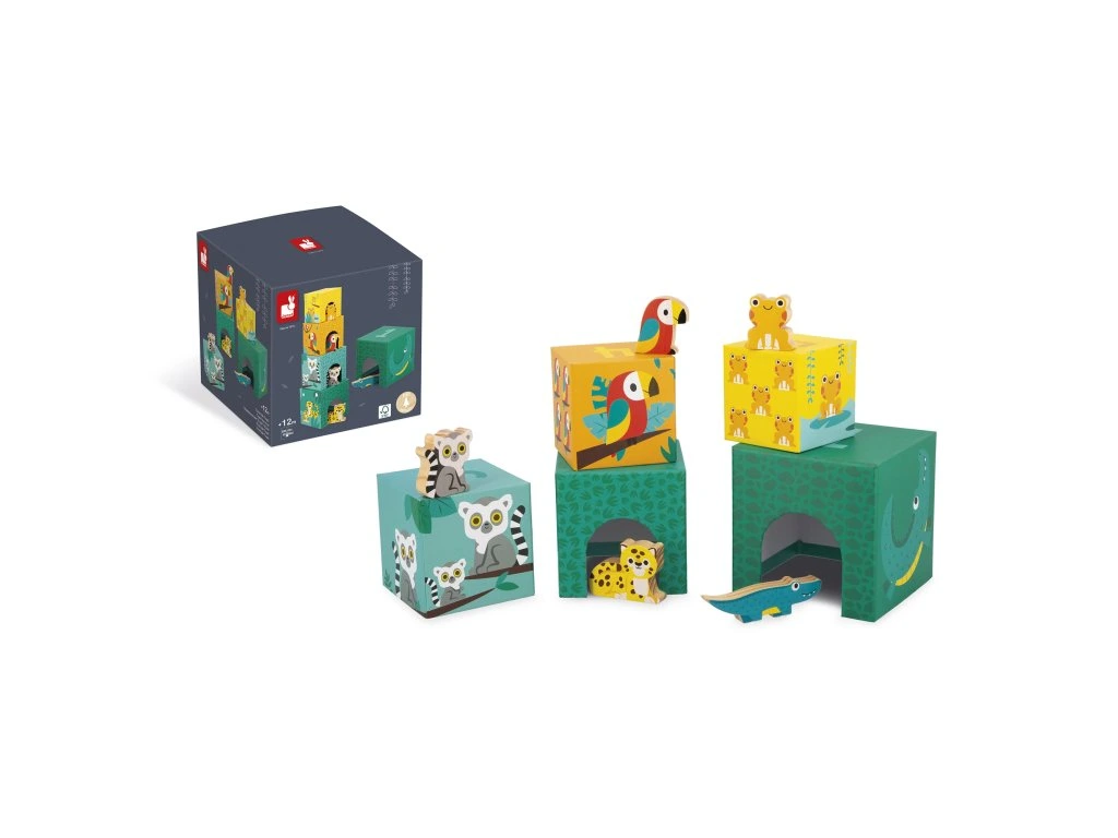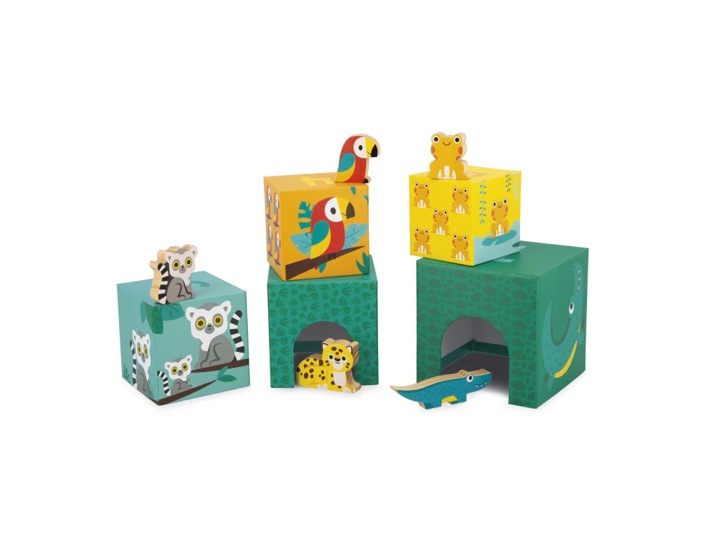 Vítejte v džungli! Zde je naše atraktivní pyramida složená z 5 kartonových kostek a 5 dřevěných zvířátek (krokodýl, jaguár, lemur, papoušek a žába). Každá kostka představuje zvíře různé velikosti a je očíslována od 1 do 5, aby se děti mohly učit počítat a zároveň se bavit! Na boku počet zvířátek odpovídá číslu na kostce. Nakonec, díky ilustracím a otvorům, vaše dítě bude moci najít, která kostka patří kterému zvířeti a schovat ji dovnitř. Rozvíjí jemnou motoriku a koordinaci ruka-oko. Hračka je vyrobena ze dřeva a kartonu s certifikátem FSC™ a vhodná pro děti od 12 měsíců.