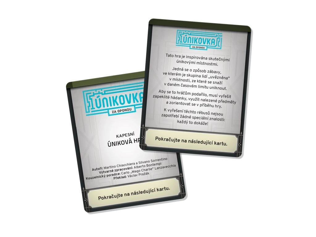 Únikovka Za oponou je kartovou variací populárních únikových her, kde se skupina přátel nebo kolegů (hrát lze i samostatně) snaží uniknout z místnosti plné rébusů v časovém limitu. Hra je plná výzev – buď všichni uspějete, nebo společně selžete, protože jde o kooperativní hru.
