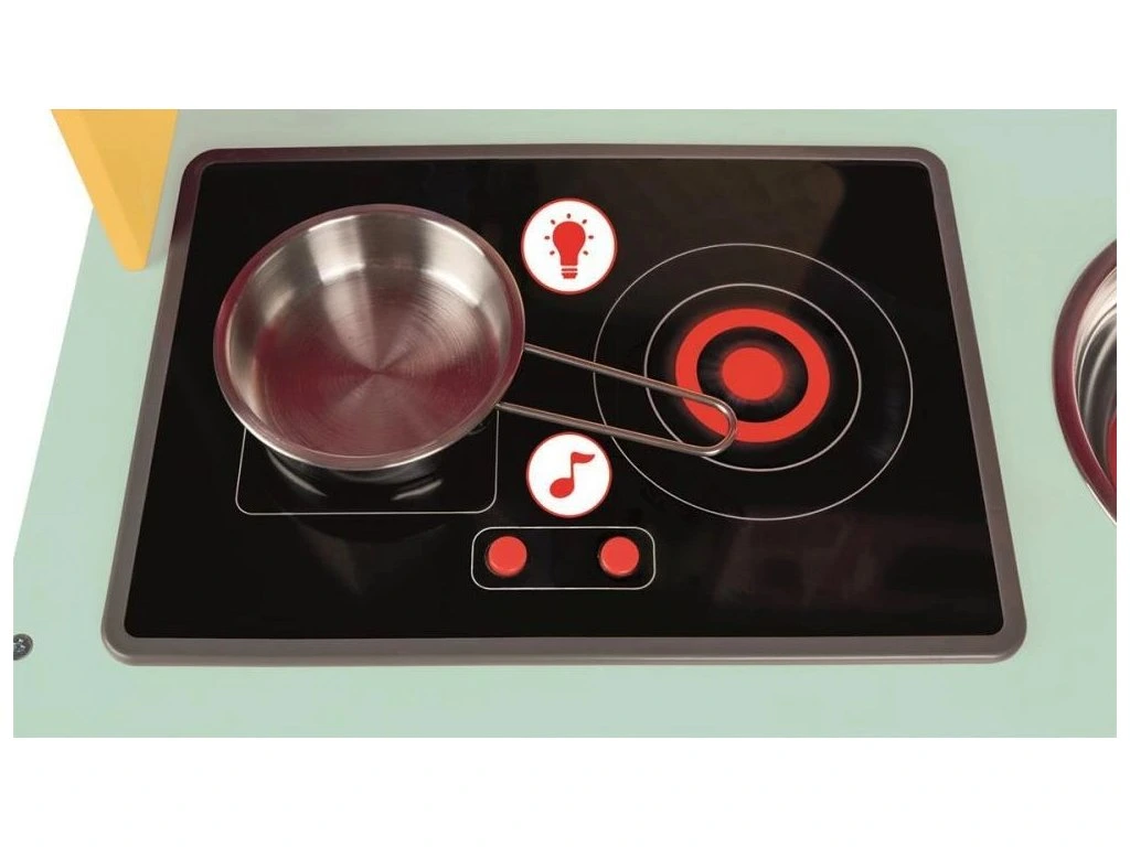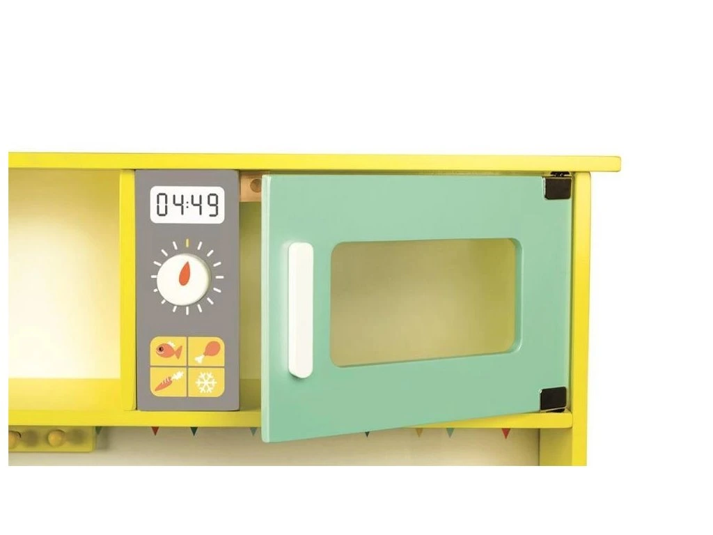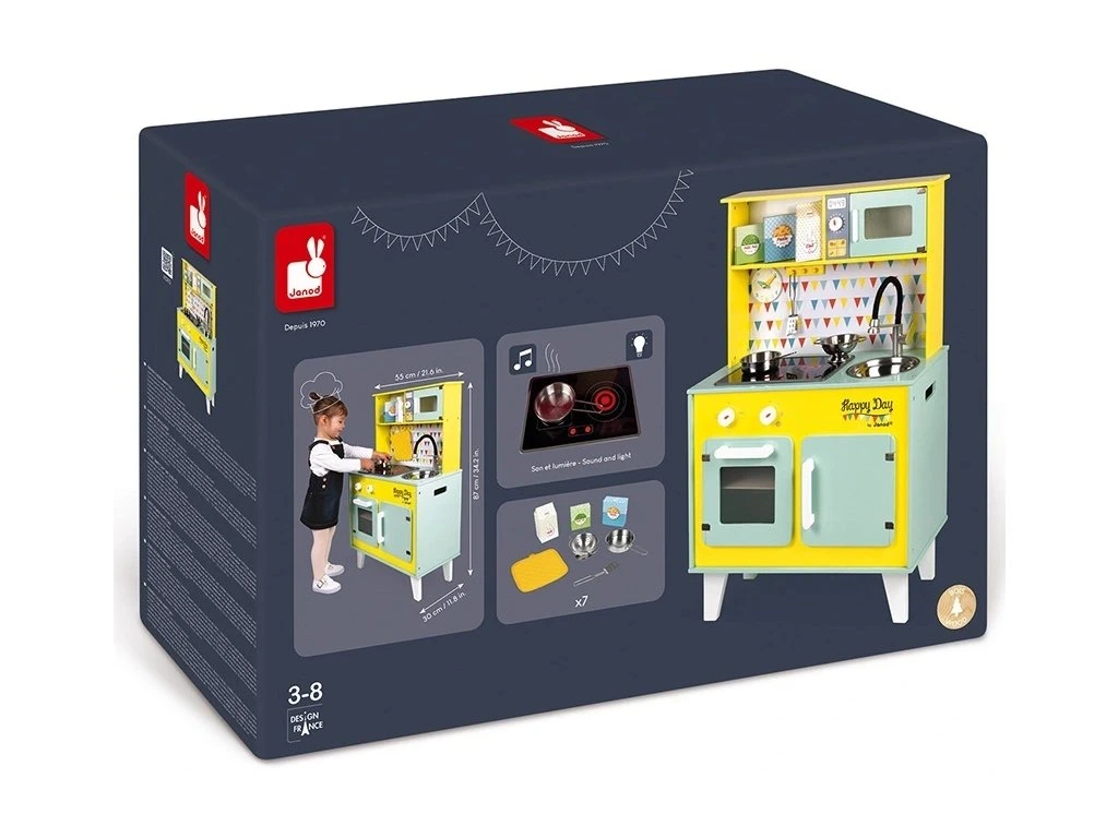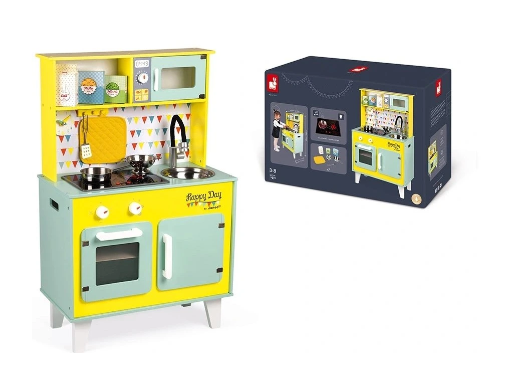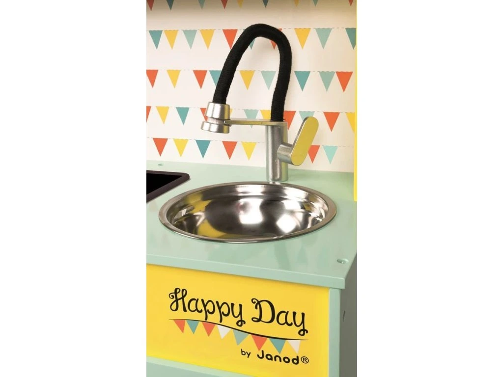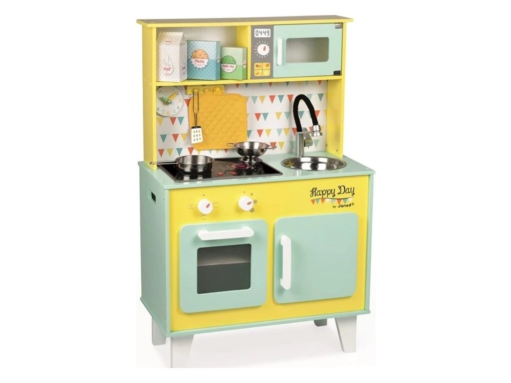 Kuchyňka Happy Day – barvy, které rozzáří pokoj! Tato veselá kuchyňka potěší malé šéfkuchaře i šéfkuchařky svými hravými barvami. Kuchyňka obsahuje mikrovlnku, varnou desku, dřez a troubu a je vybavena praktickými detaily, které udělají hru ještě realističtější: