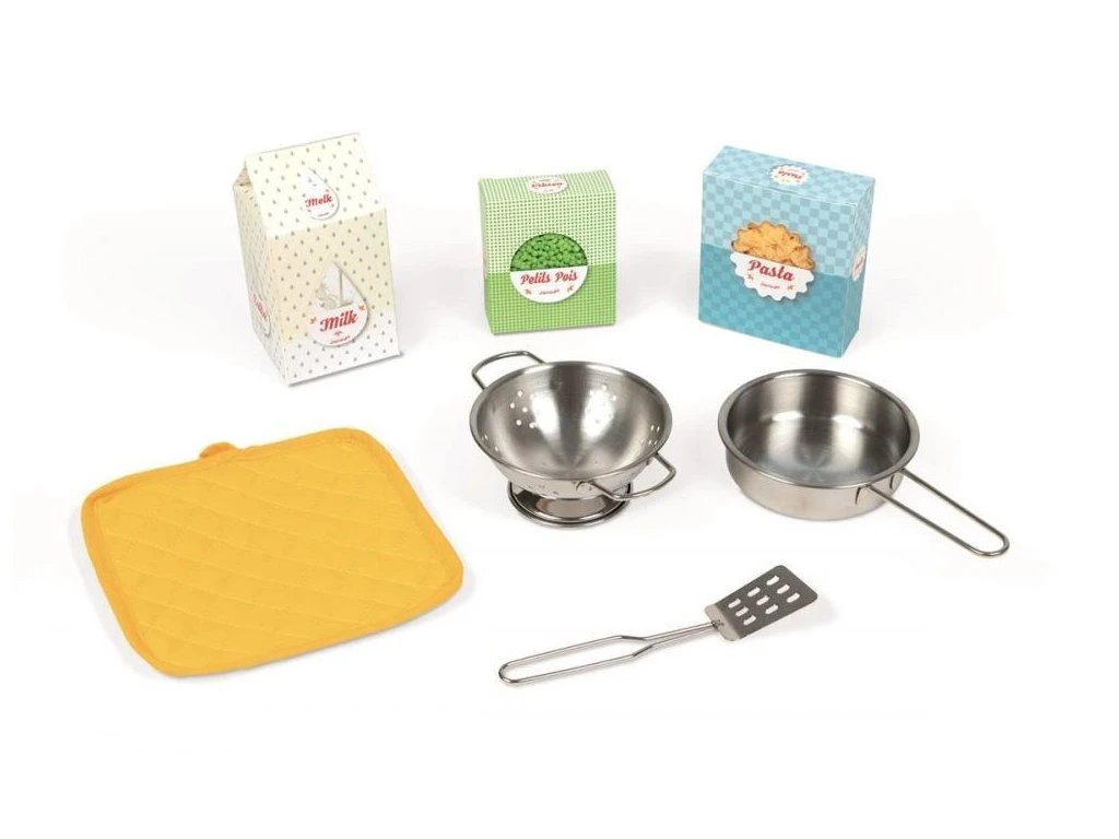 Součástí balení je také příslušenství pro kuchaře: sítko, hrnek, obracečka, chňapka, těstoviny, hrášek a mléko v papírových krabičkách, aby se malí kuchaři mohli cítit jako v profesionální kuchyni.