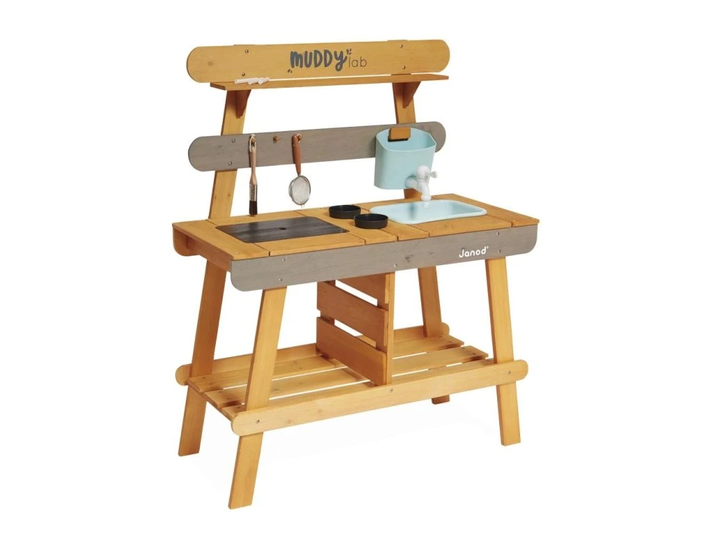 Trochu zeminy, pár stébel trávy, trocha vody, zamíchejte to všechno dohromady. Ještě nic nebylo tak zábavné! Nechte své dítě prosperovat v přírodě a rozvíjejte jeho fantazii s touto kuchyňkou z masivního dřeva. Tato hračka je vhodná na venkovní použití, odolá všem experimentům malých i velkých. Muddy Lab je dodávaná s 10 doplňky, je skvělá na objevování přírody. Skládá se ze 2 umyvadel a 2 vyjímatelných plastových květináčů: ideální na sbírání květin nebo nabírání zeminy! Umyvadlo se skutečným kohoutkem: stačí ho naplnit a otočit kohoutkem zprava doleva, aby mohla voda téct! Kovové sítko a štěteček jsou k dispozici také pro usnadnění výzkumu vašeho malého vědce. Nakonec, jako odměnu za všechny své objevy bude mít vaše dítě 3 kusy křídy a odnímatelnou tabulku na psaní. Muddy Lab umožní vašemu dítěti rozvíjet kreativitu a vnímavost k přírodě a zároveň se bavit samostatně nebo s ostatními.Hračka je vyrobena ze dřeva s certifikátem FSCTM. Dřevo je organický materiál. V důsledku toho mohou mít některé desky suky a barevné variace. Chraňte před špatným počasím.