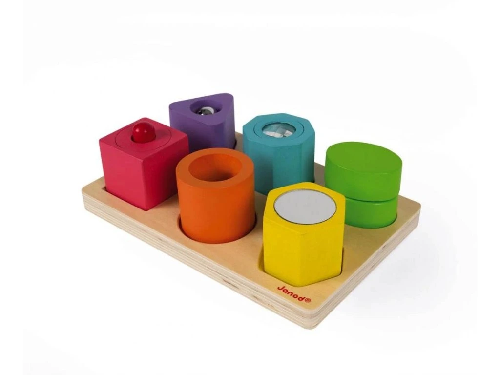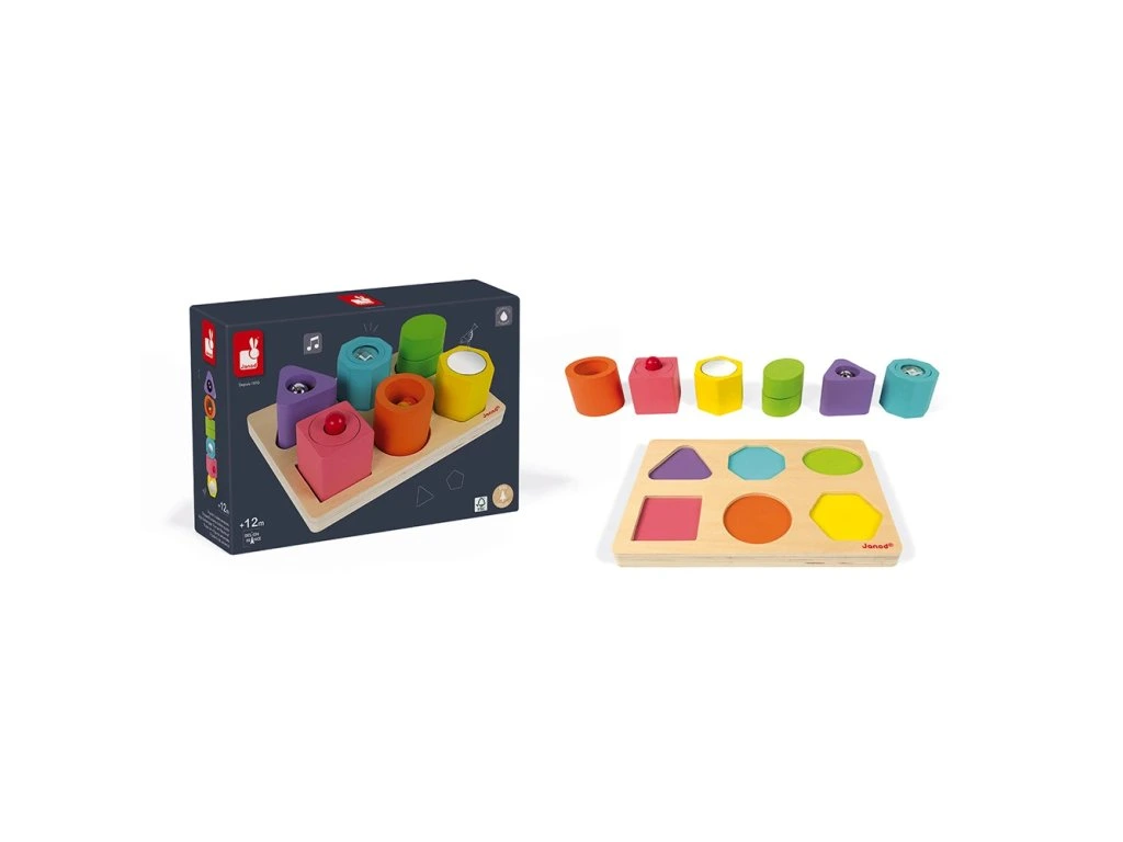 Dřevěná hračka na vkládání a třídění s předlohami Janod série Montessori Learning Toys.