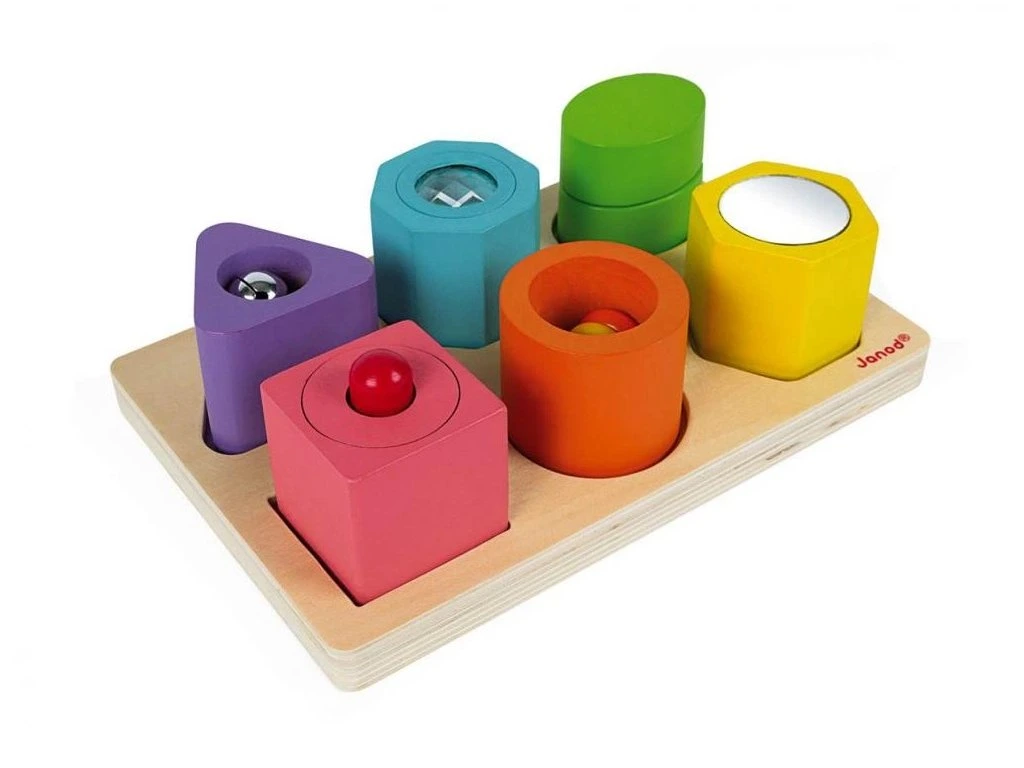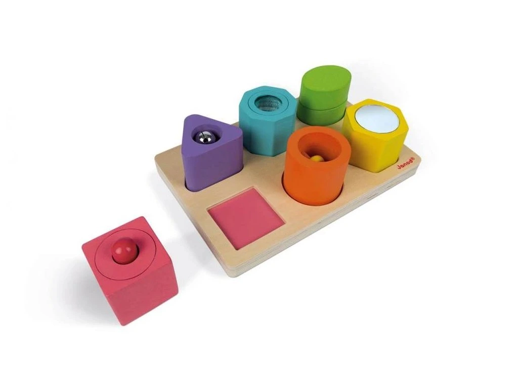 Každý dílek v této barevné smyslové vkládací puzzle má svou vlastní zajímavou funkci:
