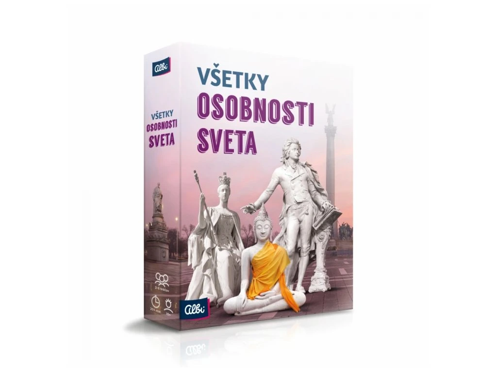 Obsah hry: 195 karet s osobnostmi, 5 přehledových karet, 6 desek hráčů, přehled osobností, pravidla hry v slovenštině.
