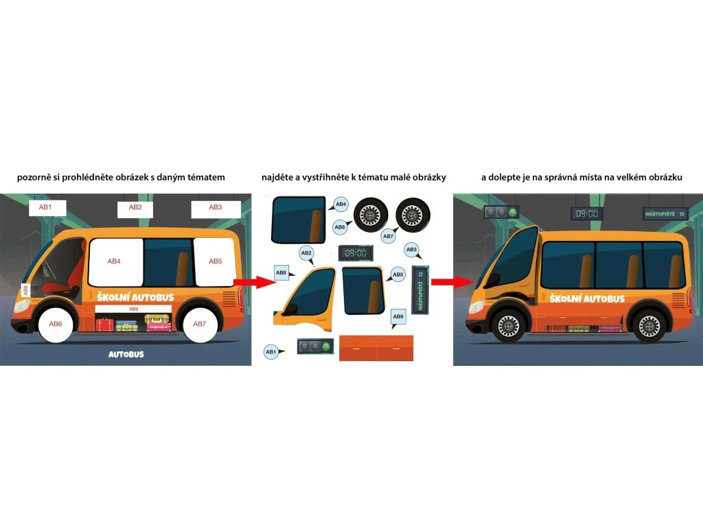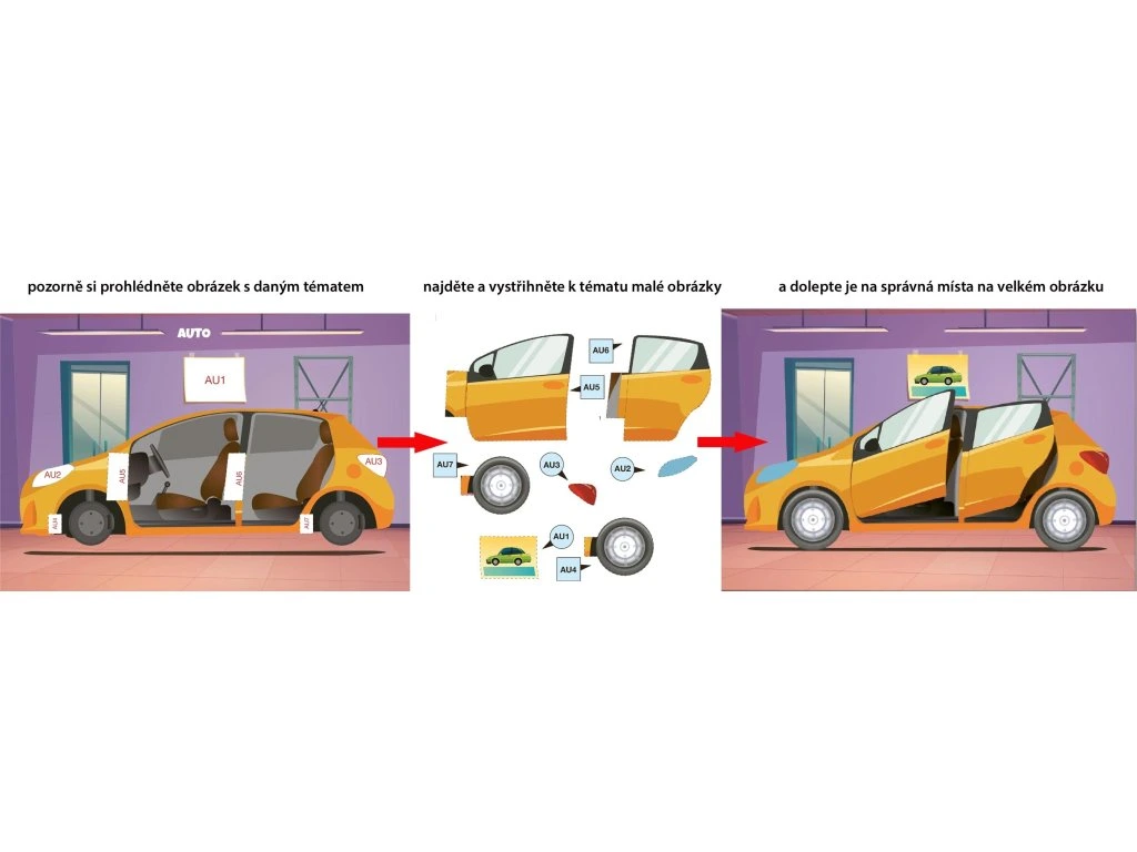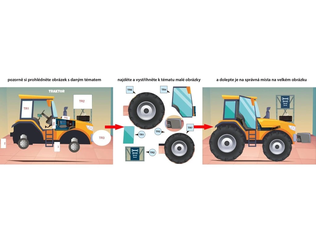 Na velkém obrázku jsou bílá místa (označená číslem a písmenem). Na tato bílá místa se nalepí příslušné vystřižené dílky se stejným číslem a písmenem. K orientaci pomáhají barevné předlohy na vnitřní straně obálky. Nalepením všech správných dílků vzniknou hotové obrázky.
