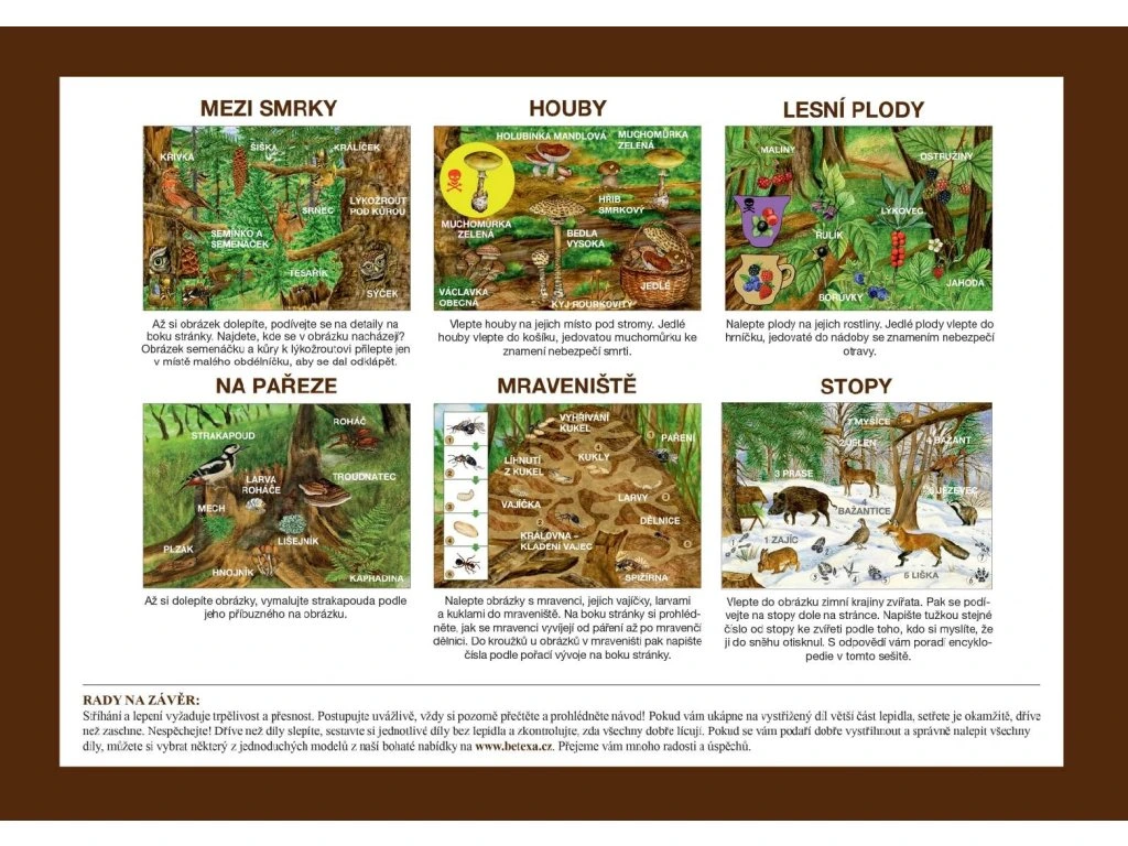 - Mezi smrky: Po dolepení obrázku si prohlédněte detaily na boku stránky. Obrázek semenáčku a kůry k lýkožroutovi přilepte jen v místě malého obdélníku, aby se dal odklapnout.