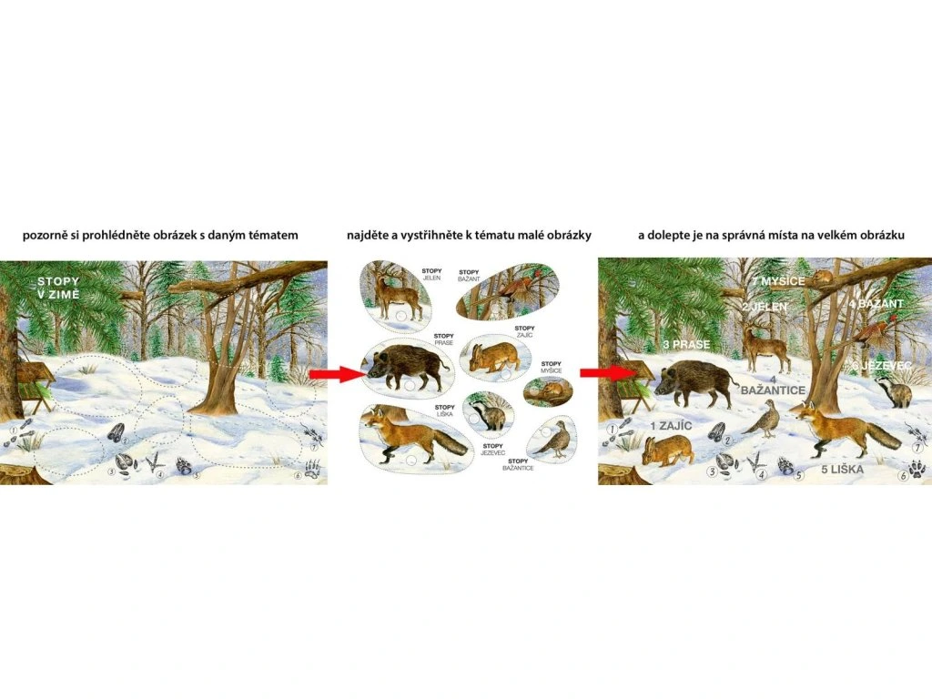 - Stopy: Vlepte do obrázku zvířata v zimní krajině. Potom porovnejte stopy dole na stránce a napište číslo od stopy ke zvířeti podle toho, kdo ji otiskl. Pomoc poskytuje encyklopedie v sešitě.