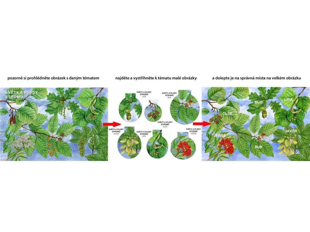 - Květy a plody stromů: Přilepte ke květům plody. Dílky přilepte jen v místě malého obdélníku a ohněte podle čerchované čáry. Můžete se podívat pod plod, z jakého květu se vytvořil.