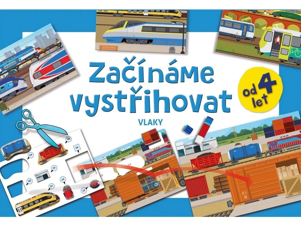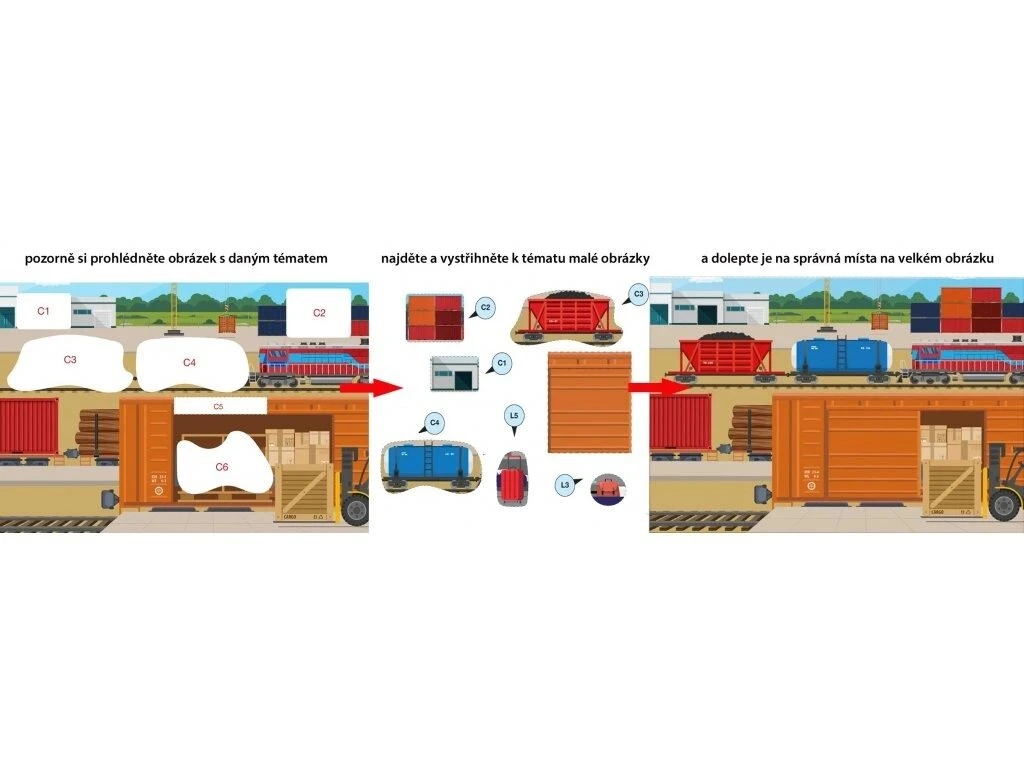 Novinka pro úplné začátečníky: děti si nejprve vystřihnou jednotlivé dílky skládačky. Na velkém obrázku jsou bílá místa (označená číslem a písmenem). Na tato bílá místa se nalepí příslušné vystřižené dílky se stejným číslem a písmenem. K orientaci pomáhají barevné předlohy na vnitřní straně obálky. Nalepením všech správných dílků vzniknou hotové obrázky.