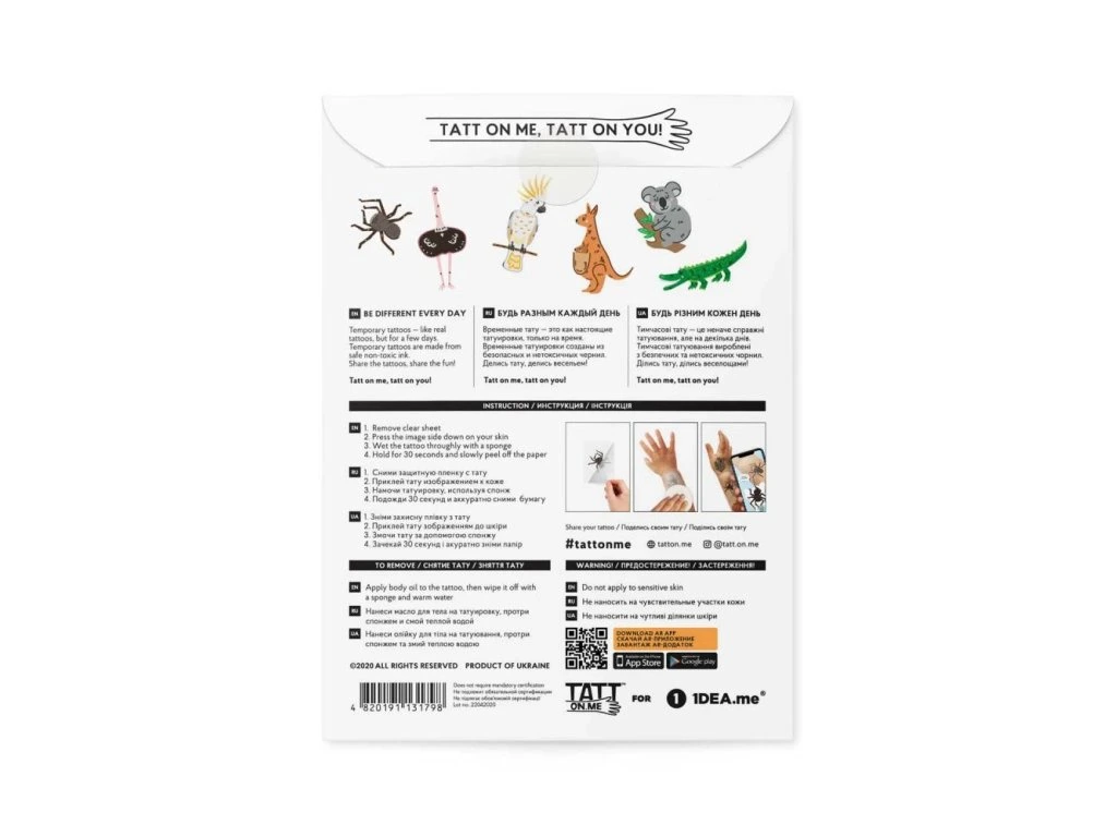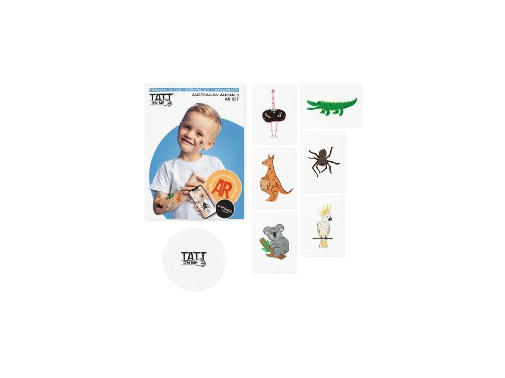 Hledáte ještě něco zajímavějšího, než běžné tetování pro děti? Živá tetování to vyřeší za vás! Naše tetování australských zvířátek jsou tím nejlepším způsobem, jak trávit čas s dítětem, které miluje objevování přírody. Dočasná tetování s pštrosem, kakadu, klokanem, koalou, krokodýlem a pavoukem jsou skvělým nápadem na hraní a společně strávený čas.AR kolekce ekologických tetování se zvířátky ze všech koutů světa. Po stažení aplikace ožijí na vašem těle a řeknou vám anglicky, jak se jmenují. Skvělá pomůcka na učení anglických názvů zvířátek zábavnou formou! S živými tetováními si užije mnoho zábavy celá rodina. Potetujte se, vyfotografujte se a pozorujte, jak jednotlivá zvířátka ožívají na vašem těle, pohybují se a mluví. Tetování je možné nalepit i jako dekoraci na telefon nebo jiný předmět.